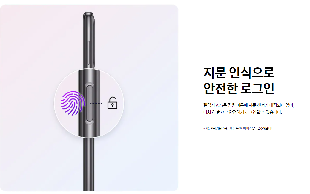 지문인식은 탑재가 되었으나, 삼성이 메인으로 밀고 있는 화면 내장 지문인식은 아니며 측면 전원 버튼 지문인식입니다. 보통 버튼에 내장되어 있는 지문인식이 반응속도가 더 빠르기 때문에, 사용자에 따라서는 이게 장점이 될 수도 있겠습니다.