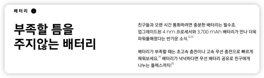 다음은 배터리입니다. 갤럭시 Z 플립3에서 가장 큰 문제로 지적받던 문제가 발열과 더불어 바로 배터리였습니다. 하지만 이번 갤럭시 Z 플립4에서는 힌지가 얇아지면서 배터리 물리 용량이 전작 대비 12% 증가하였습니다. 여기에 AP 변경에 따른 효과가 결합되어 꽤 유의미한 배터리 타임 증가가 있지 않을까 싶습니다. 둘러보니, 실사용 시간 기준으로 플립3 대비 1시간 정도 더 사용이 가능하다고 합니다.