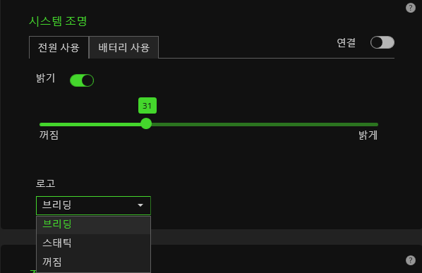 이 로고는 LED로 아주 멋있게 빛이 나며, 로고 LED 점등 형태 역시 레이저 시냅스라는 프로그램을 통해 조절할 수 있습니다.