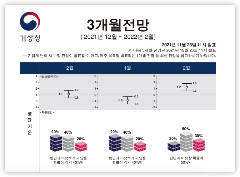 기상청 날씨 3개월 전망을 확인해 보았습니다. 일단 12월 평균기온의 경우, 평년과 비슷하거나 낮을 확률이 40% 정도 되며 그 범위는 1.1도 기준으로 위아래 0.6도 정도 되네요.