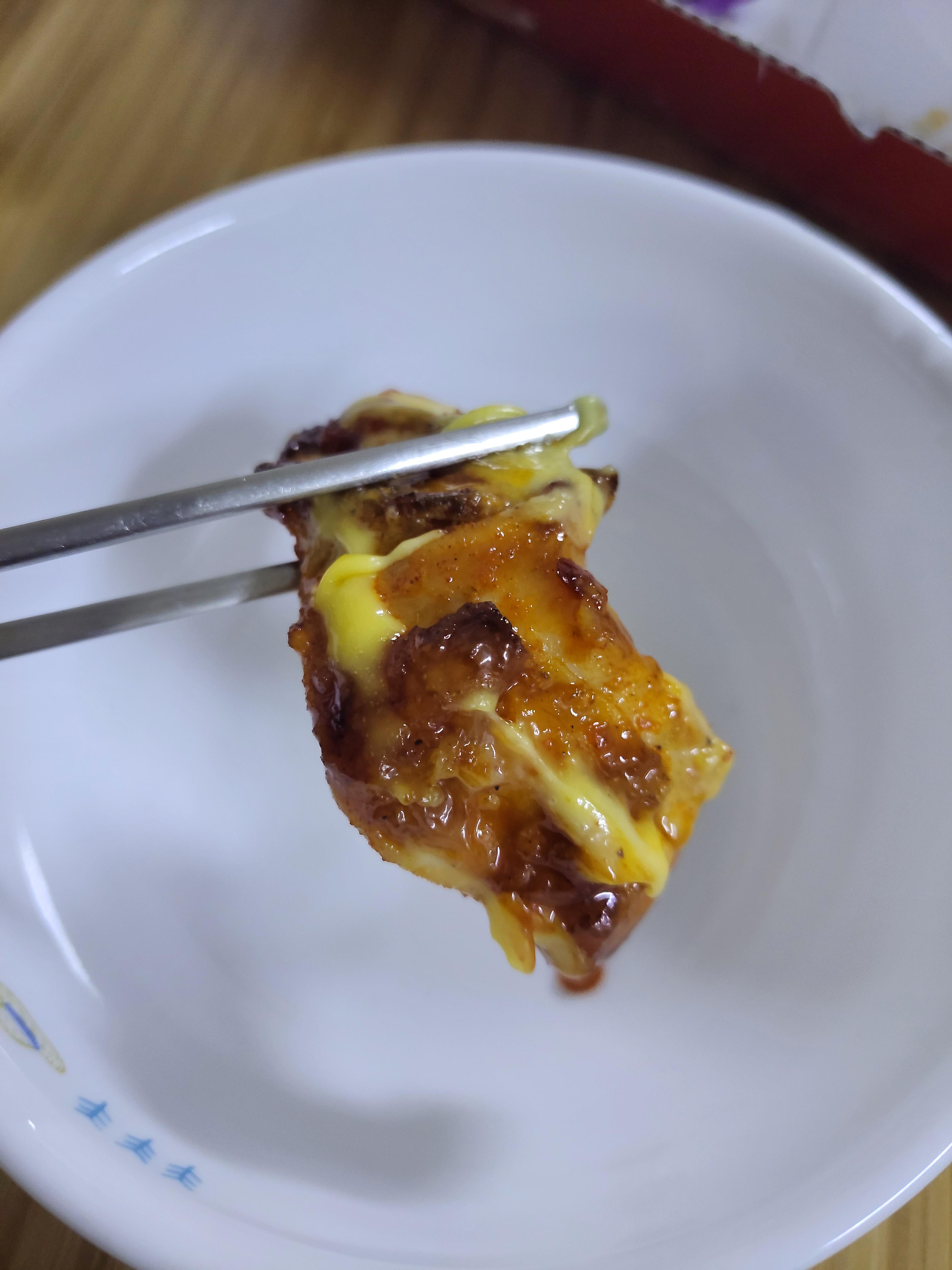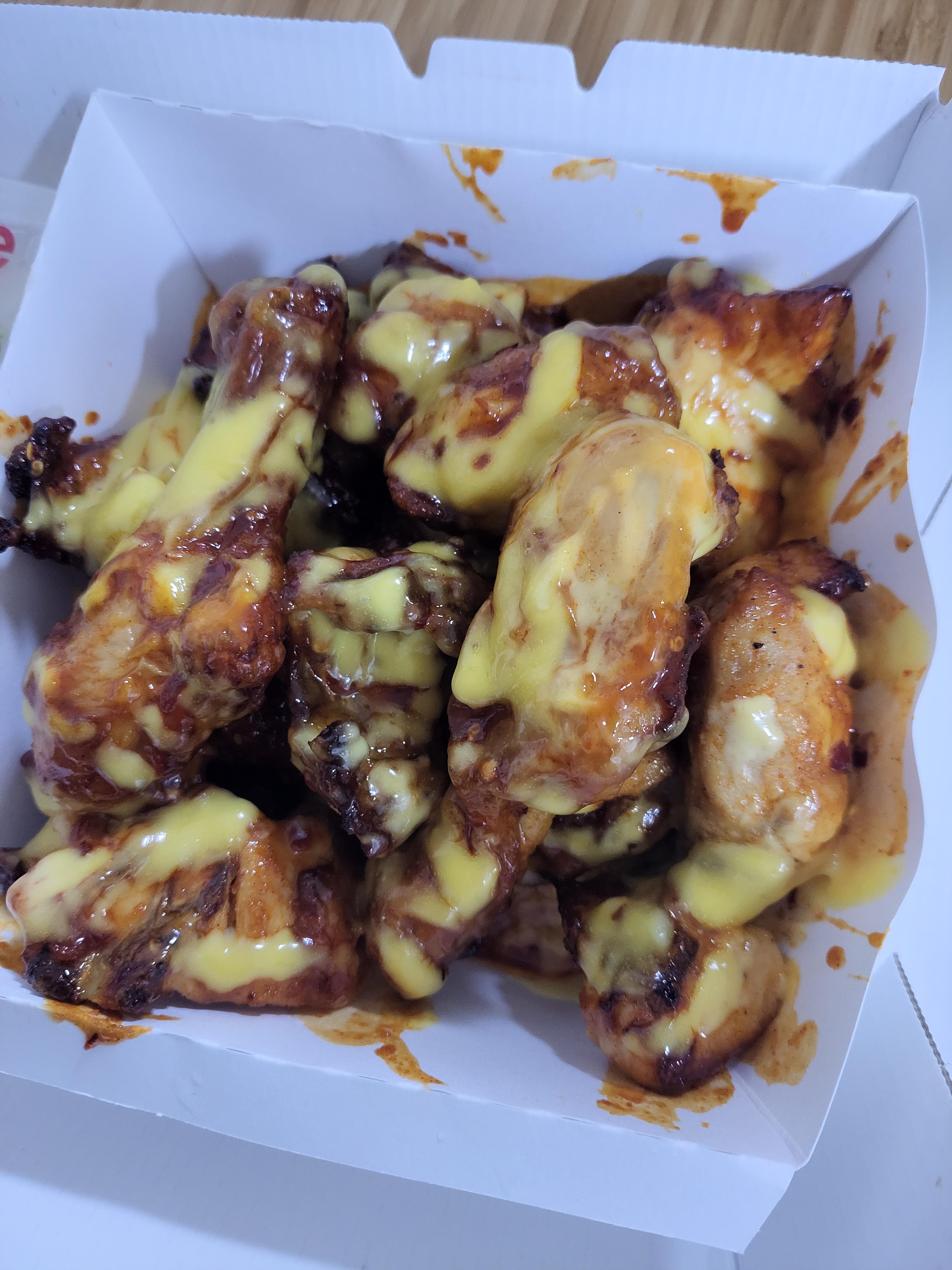 굽네 불금치킨입니다. 기본적으로는 매콤한 맛에 속하는 치킨인데, 그 위에 치즈맛 같은 연유 느낌의 그런 소스가 올라가서 맵고 달콤한 '맵단' 치킨인 것 같습니다.