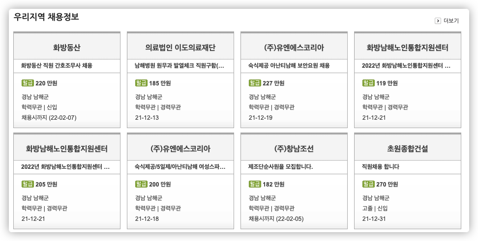 워크넷 남해군통합일자리센터 메인화면 아래쪽에 보시면, 이렇게 우리지역 채용정보가 잘 정리되어 나와있는 것을 확인하실 수 있습니다.