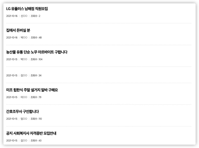 그러면 위 화면처럼 참여마당 - 구인구직 화면이 뜹니다.