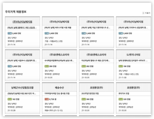 남해군 통합일자리센터 홈페이지를 보시면, 우리지역 채용정보가 1페이지에 바로 뜹니다.