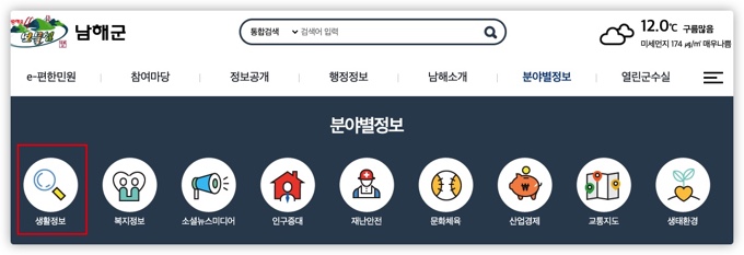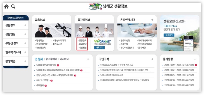 이 뿐만 아니라, 남해군 홈페이지 내 '생활정보'를 눌러보시면 공공근로와 취업상담, 그리고 여성취업 관련 정보를 얻으실 수 있습니다.