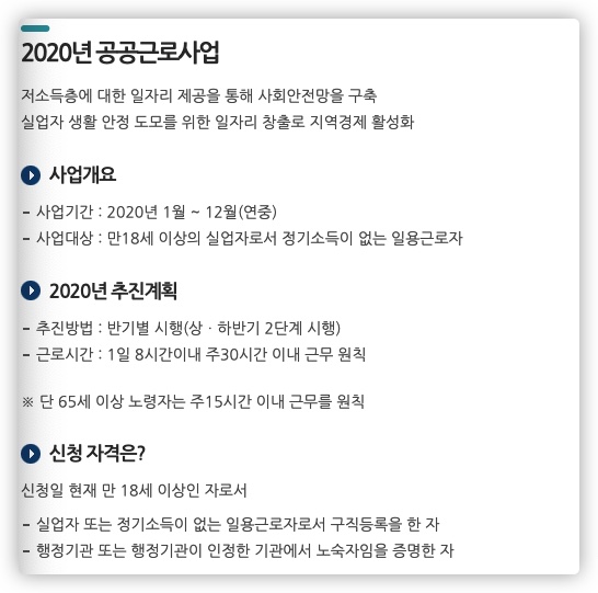 또다른 공공일자리사업 중 하나인 공공근로사업 역시 지역공동체 일자리사업과 신청 자격 등은 유사하니 참고하시면 되겠습니다.