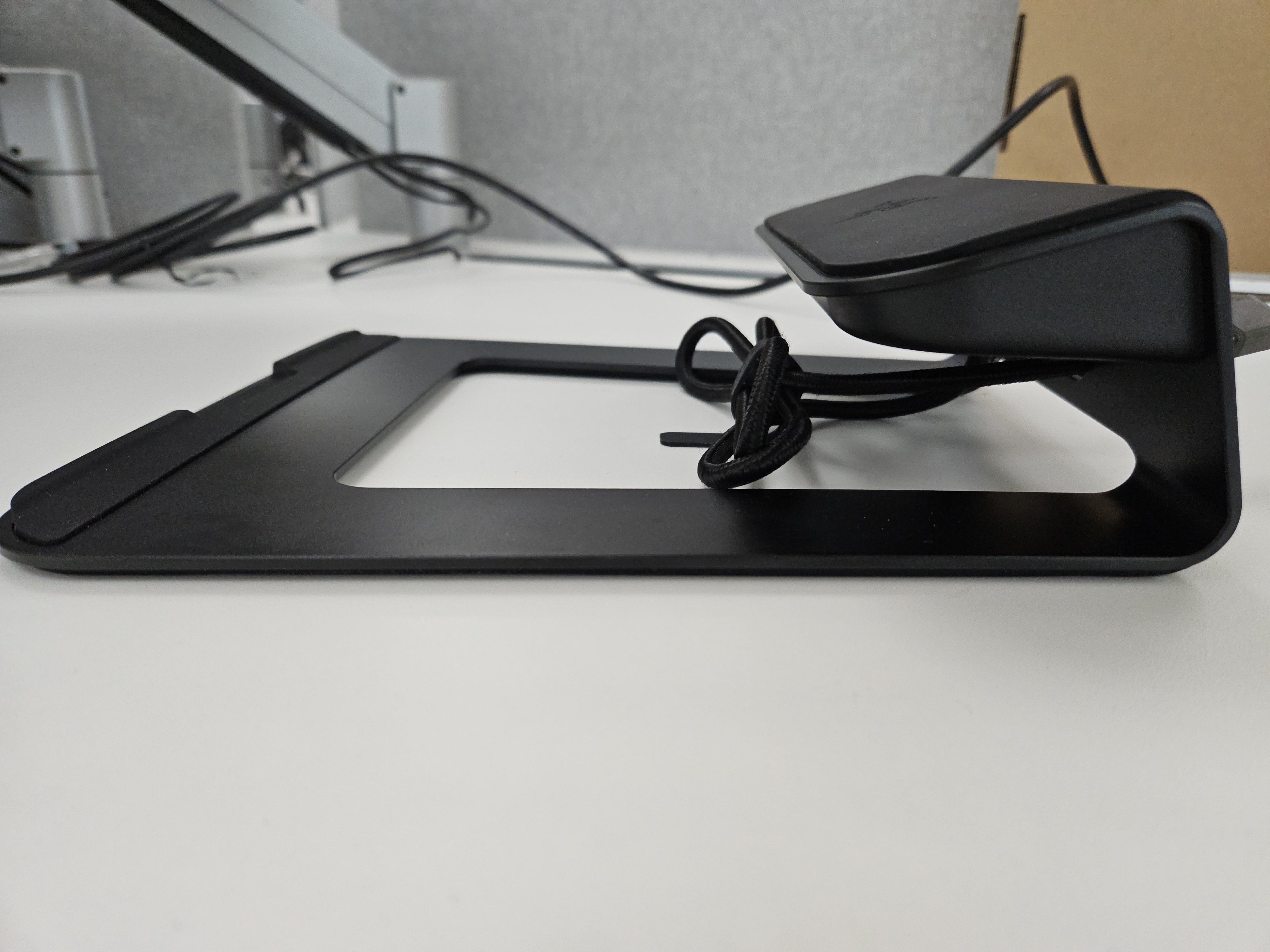 옆에서 보면 요런 식으로 생겼습니다. 맥북에 어울릴 것 같은 알루미늄 거치대들과 유사하게 생긴 스타일이며, 적당한 각도로 거치해 줍니다.
