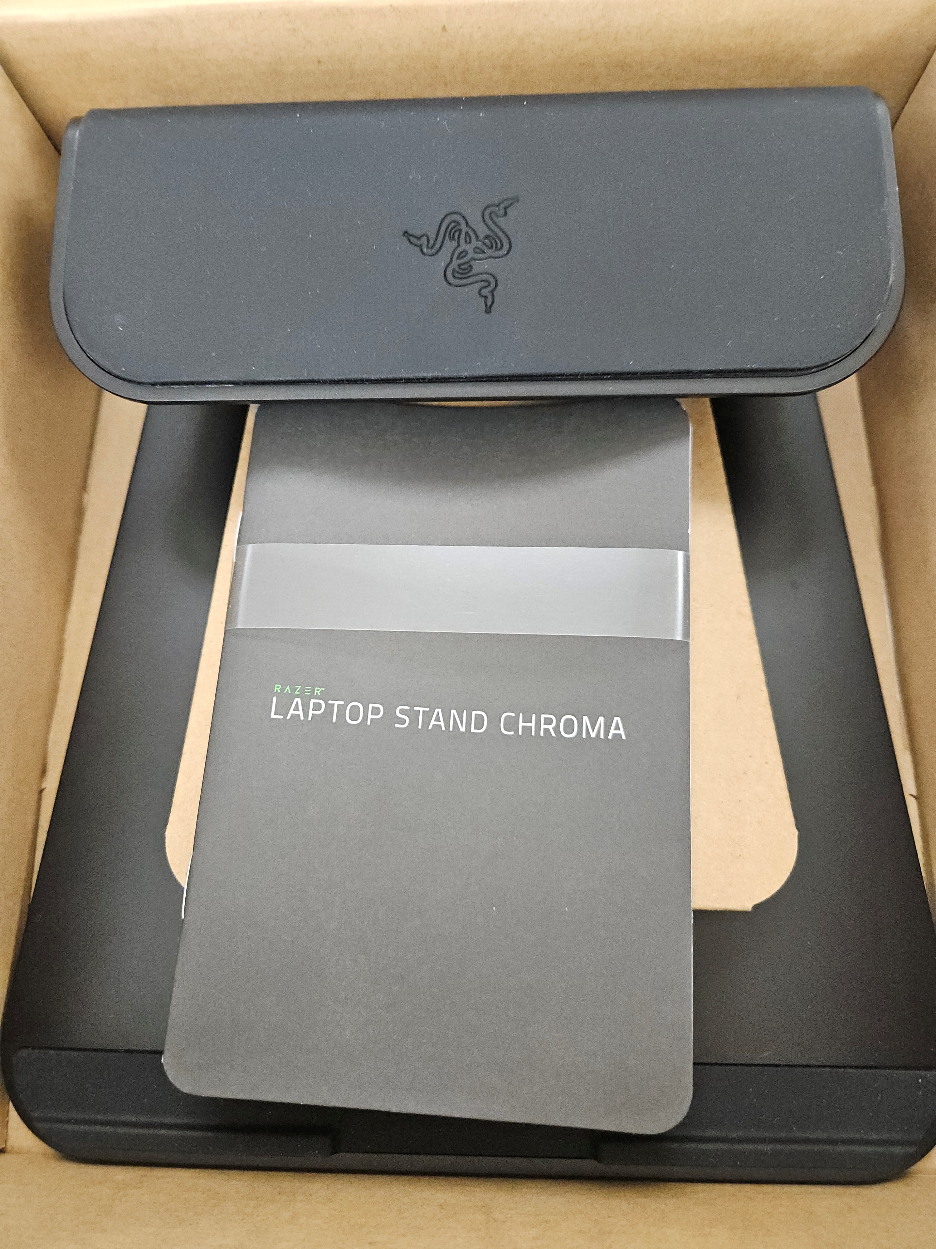 레이저 크로마 스탠드 v1 패키징입니다. 친환경적인 종이박스 형태로 되어 있고, 레이저 로고가 매우 크게 인쇄되어 있습니다.
