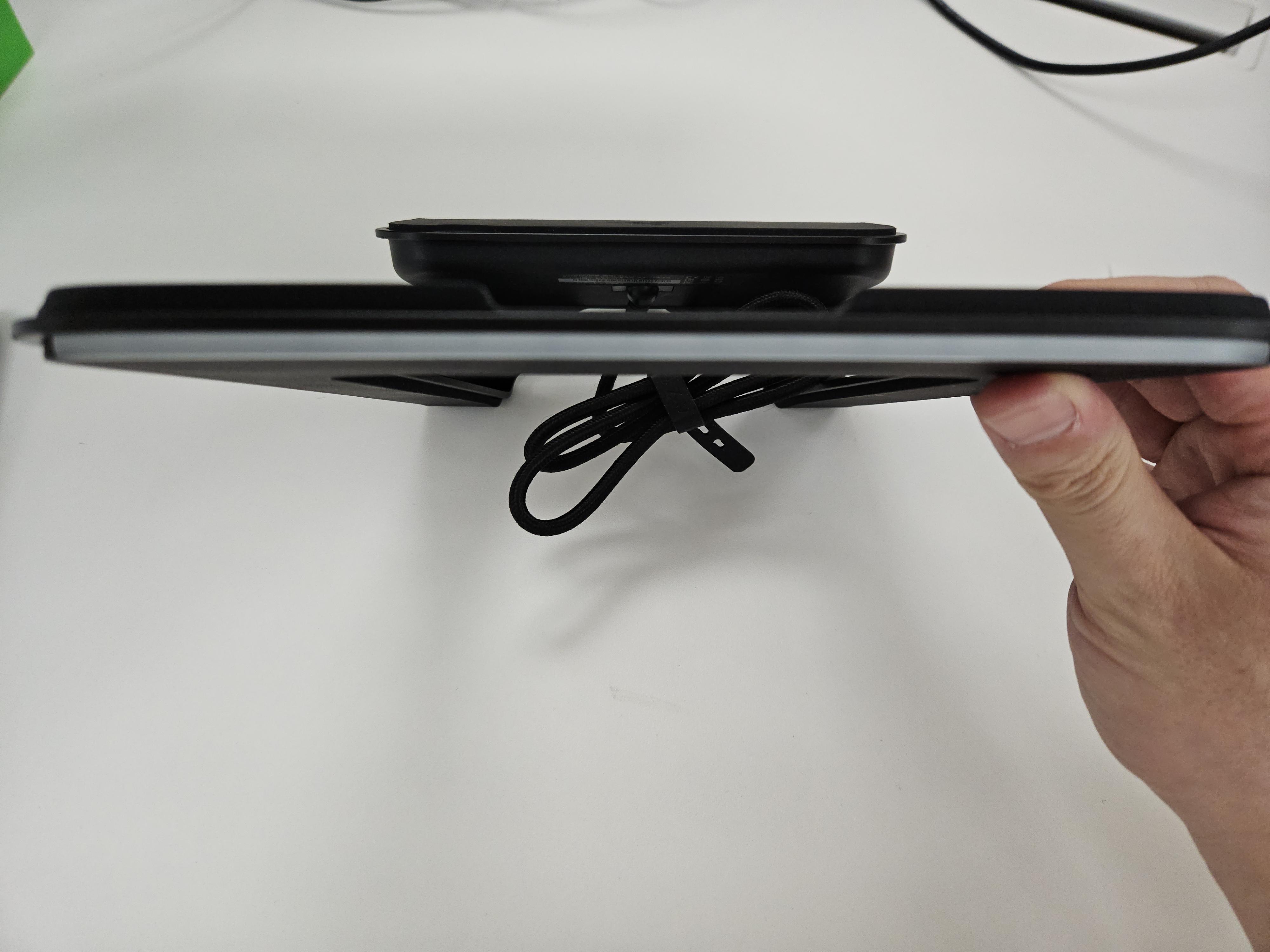 하단부를 들어보니, 하얗게 되어 있습니다. 이렇게 처리되어 있는 이유는, 바로 이 하단부에서 RGB가 발산되기 때문인데요. 이 부분이 가장 매력적인 포인트라 할 수 있습니다. 그리고 사진에는 없는데, 레이저 크로마 스탠드 뒷면에는 3개의 USB 포트가 있어서 확장 허브 식으로도 사용이 가능합니다.