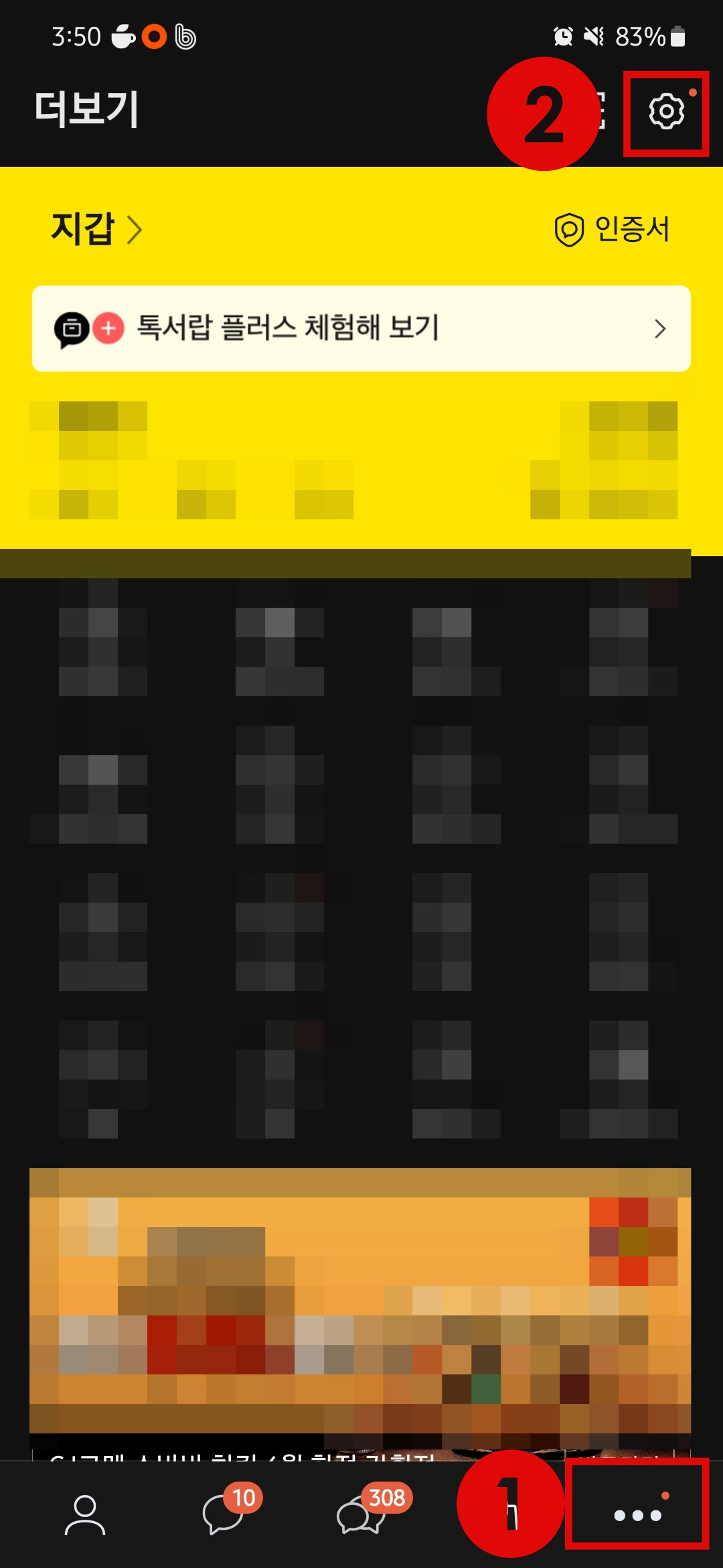 3. 우측 하단 더 보기(점 3개)를 누르고, 우측 상단에 있는 톱니바퀴(설정) 버튼을 눌러줍니다.