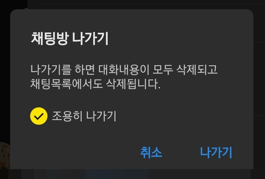 9. 사진과 같은 팝업창이 뜨면, 조용히 나가기에 체크표시를 해 주고 나가기를 누르면 단톡방 조용히 나가기가 완벽하게 됩니다.