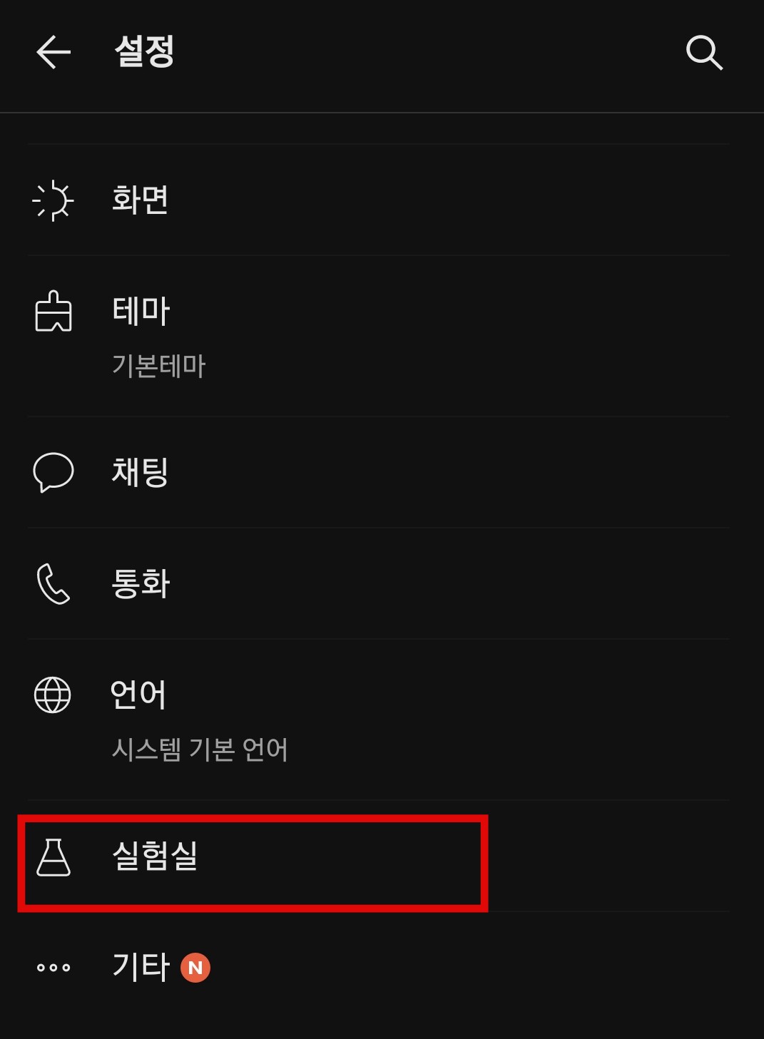 4. 설정 진입 후 아래로 내려 '실험실'을 눌러줍니다.