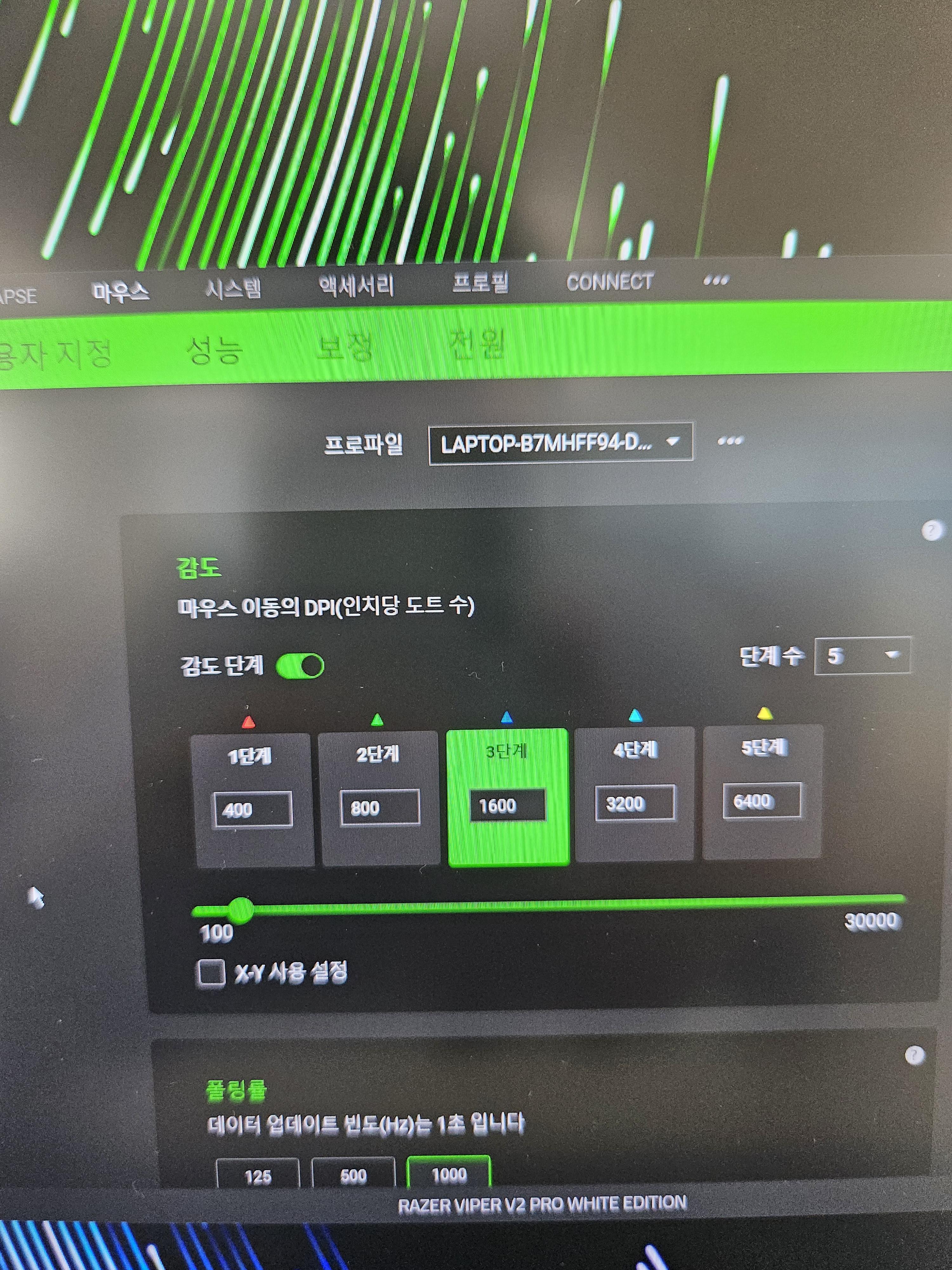 시냅스에서 설정해 둔 DPI 모드는 마우스 바닥에 있는 전원 통합 버튼을 한 번씩 눌러줌으로써 세팅 변경이 가능합니다.