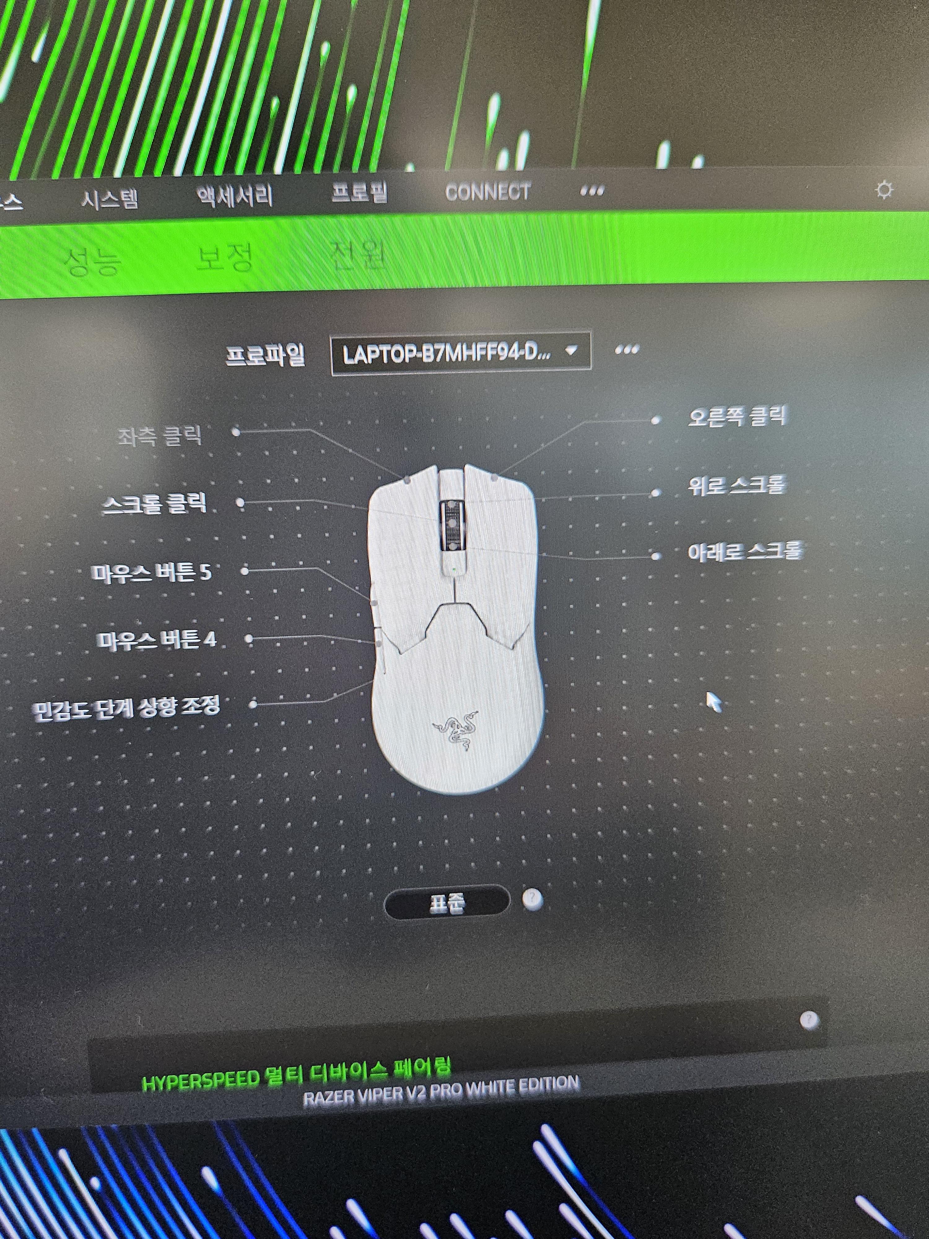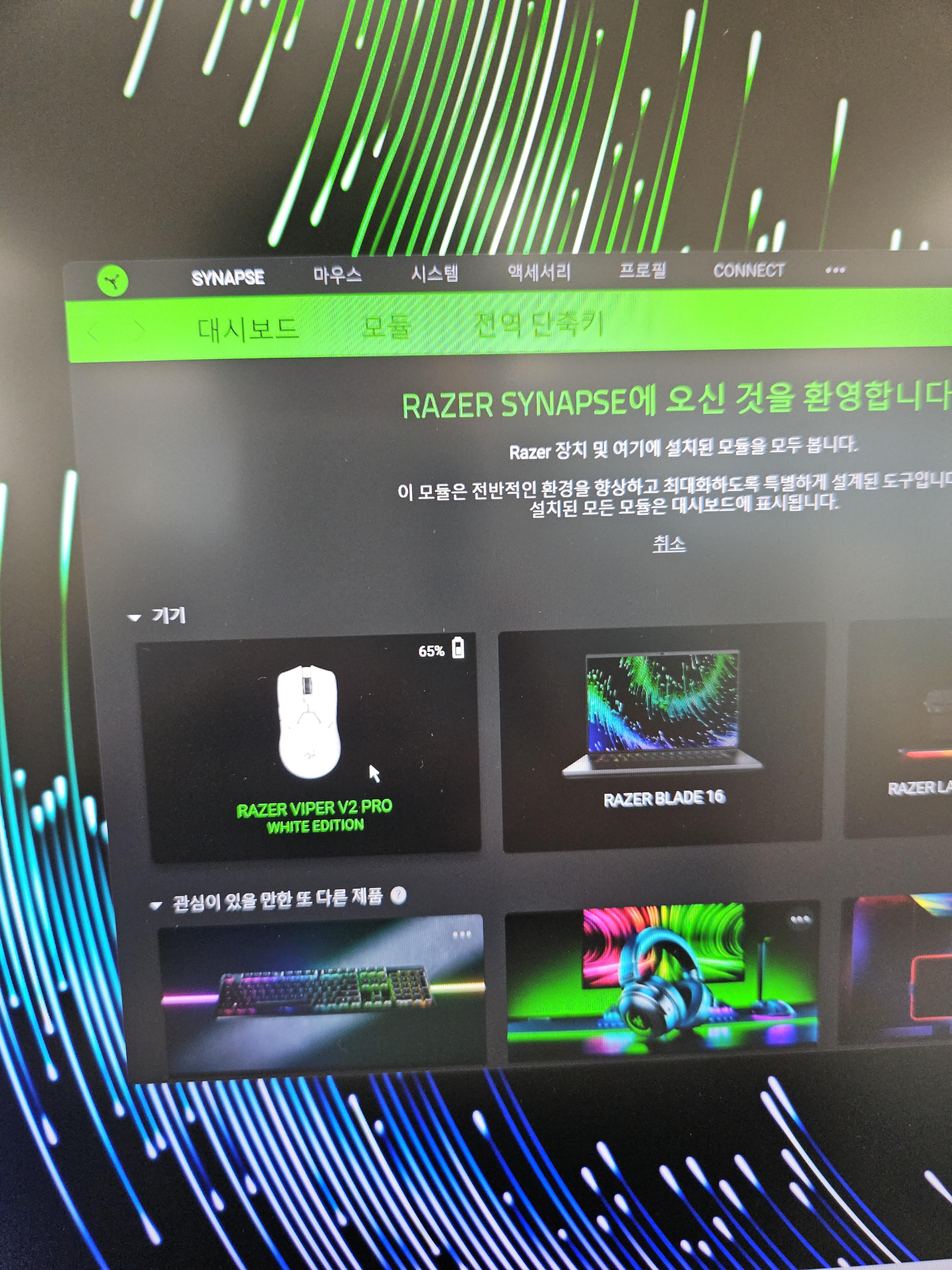 레이저 바이퍼 v2 pro 머큐리를 연결 후 레이저 시냅스를 설치 실행하면 이렇게 마우스가 시냅스에 잡힙니다.