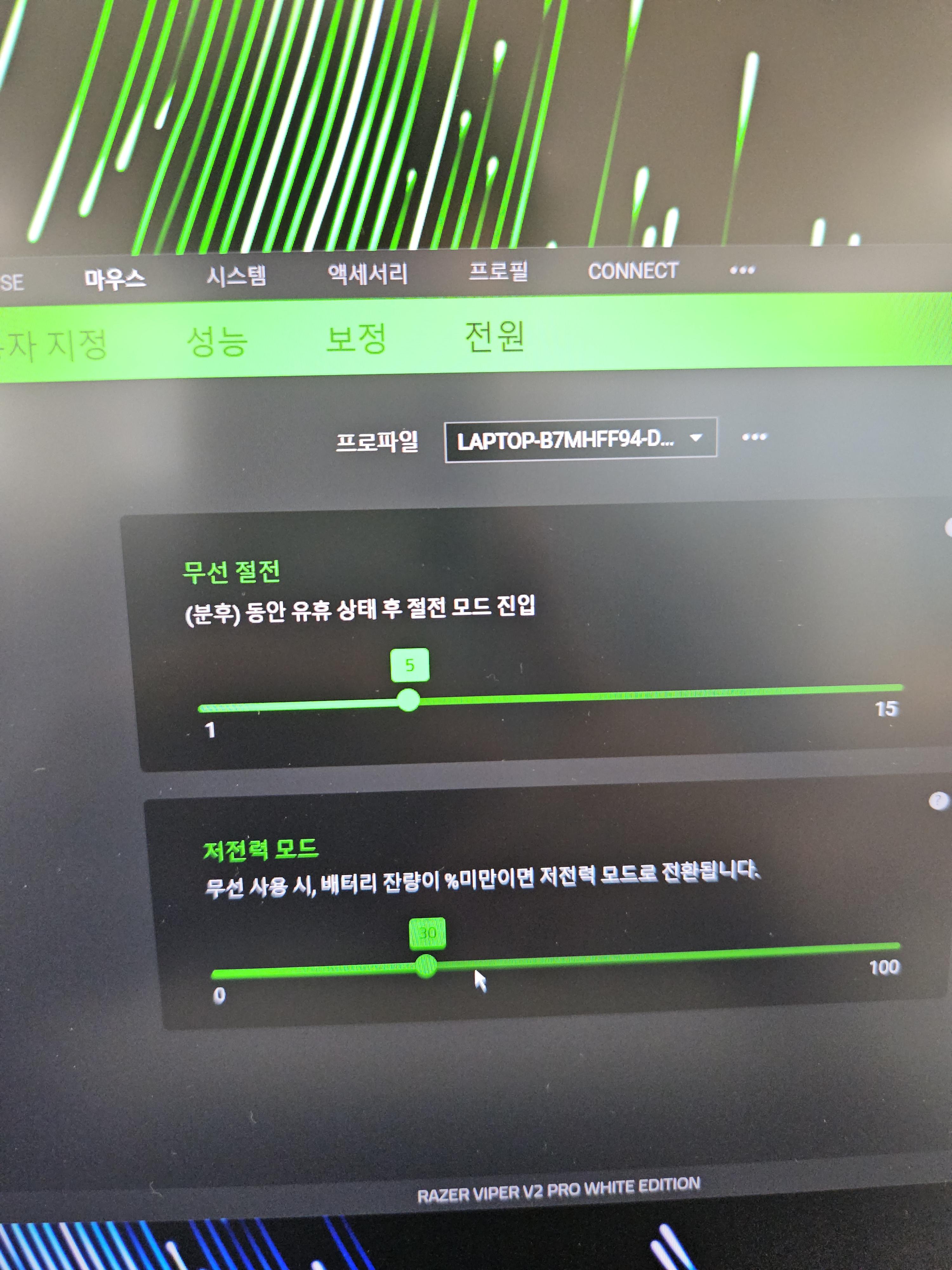 레이저 바이퍼 v2 pro 머큐리는 최대 80시간까지 사용이 가능합니다. 사실 사무용 마우스에 비하면 성능 차이와 무게 등으로 인해 사용시간이 길지는 않은 편인데요. 그래서인지 유휴 상태 후 절전 모드 진입하는 시간 설정, 저전력모드가 켜지는 시간 등을 레이저 시냅스에서도 설정할 수 있었습니다.