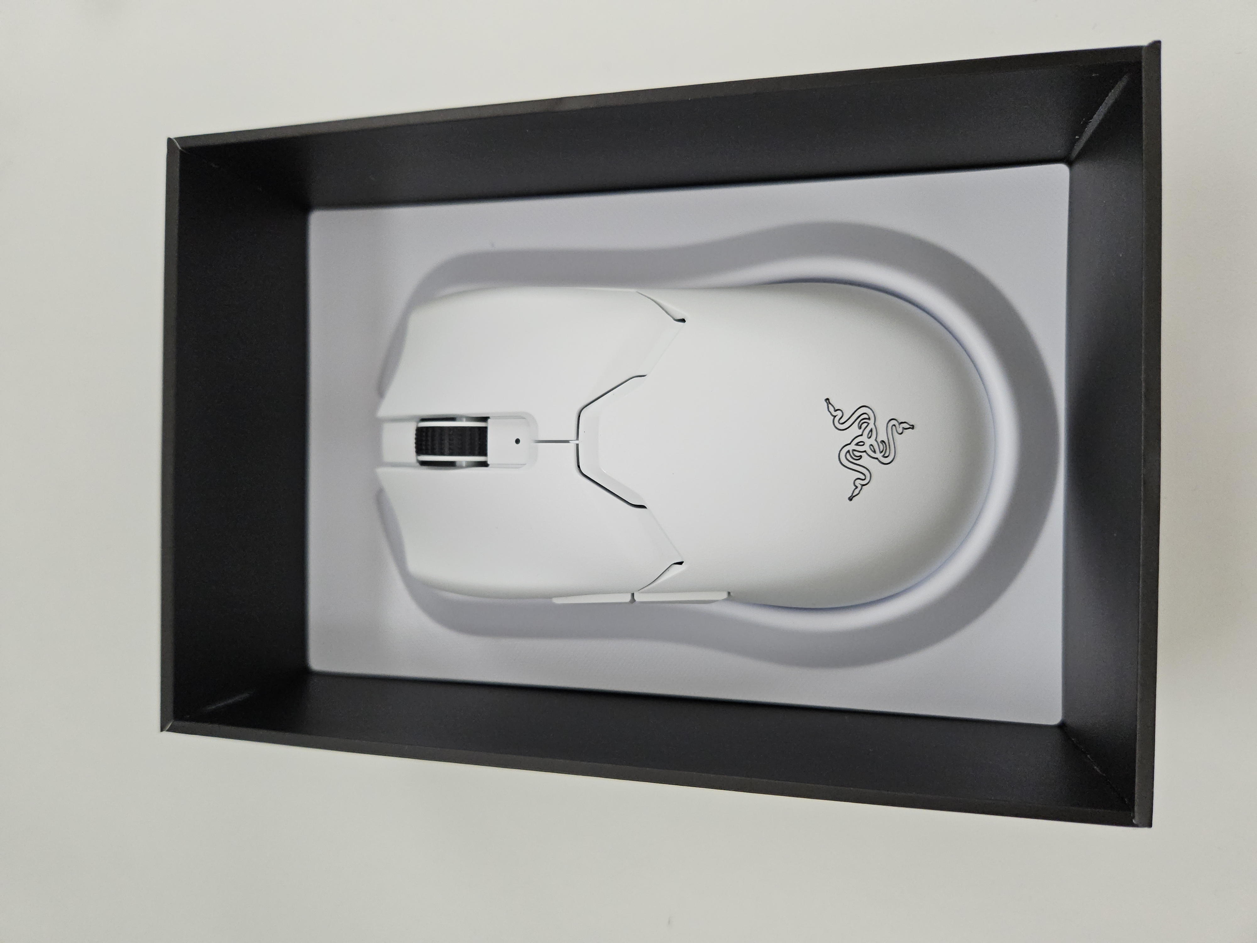 박스를 열면, 레이저 바이퍼 v2 pro 머큐리가 모습을 드러냅니다. 고운 화이트 색상이고, 검은색 프린팅의 레이저 로고, 그리고 검은 스크롤휠까지. 화이트에 블랙 포인트가 적절히 들어가서 멋진 디자인을 보여줍니다.