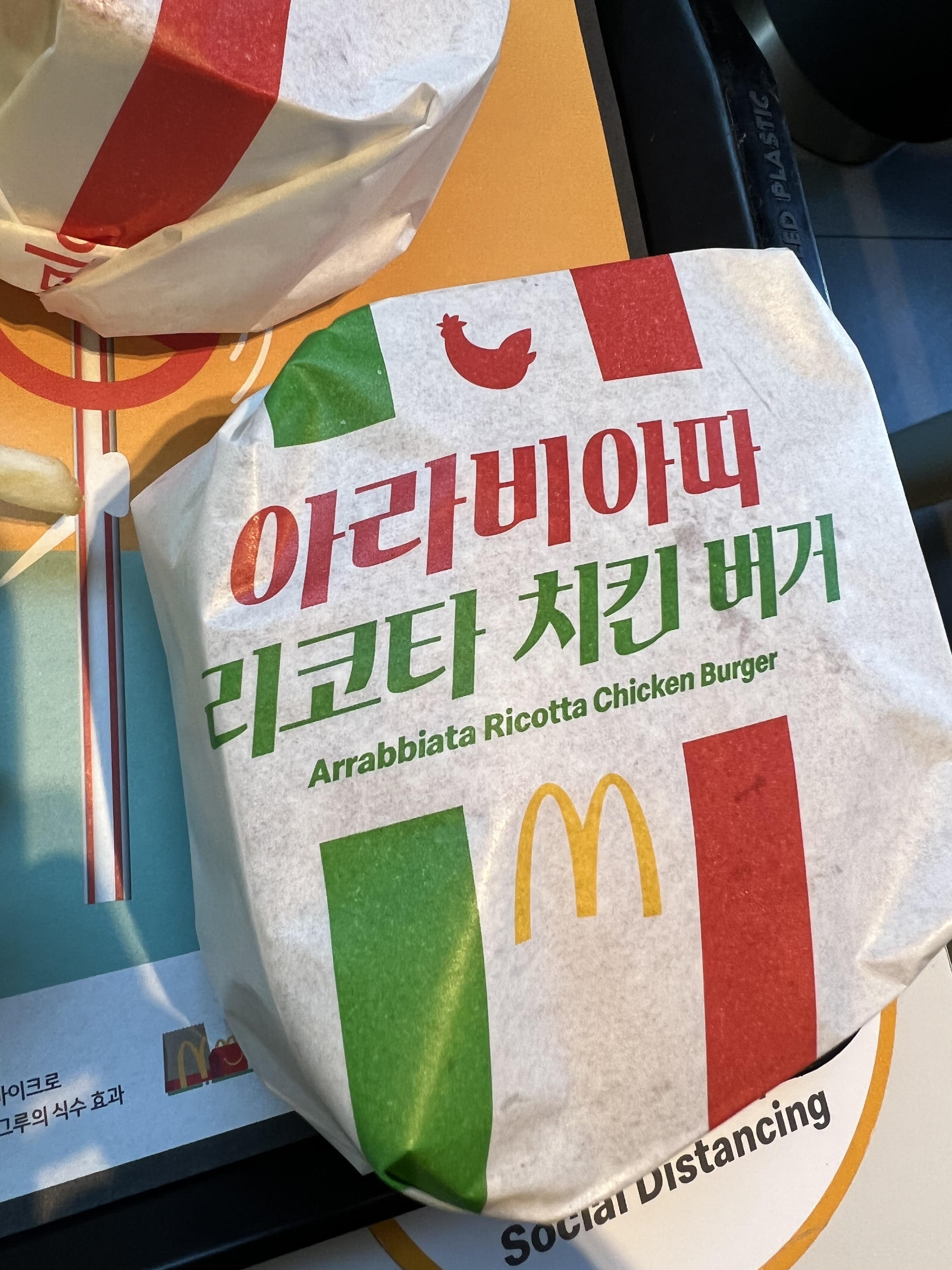 원래 식당 같은데서 신메뉴 별로 도전 안 하는데, 이번에는 이름에서 끌려서 도전해 본 맥도날드 신메뉴 아라비아따 리코타 치킨 버거였습니다. 개인적으로는 도전 성공입니다.