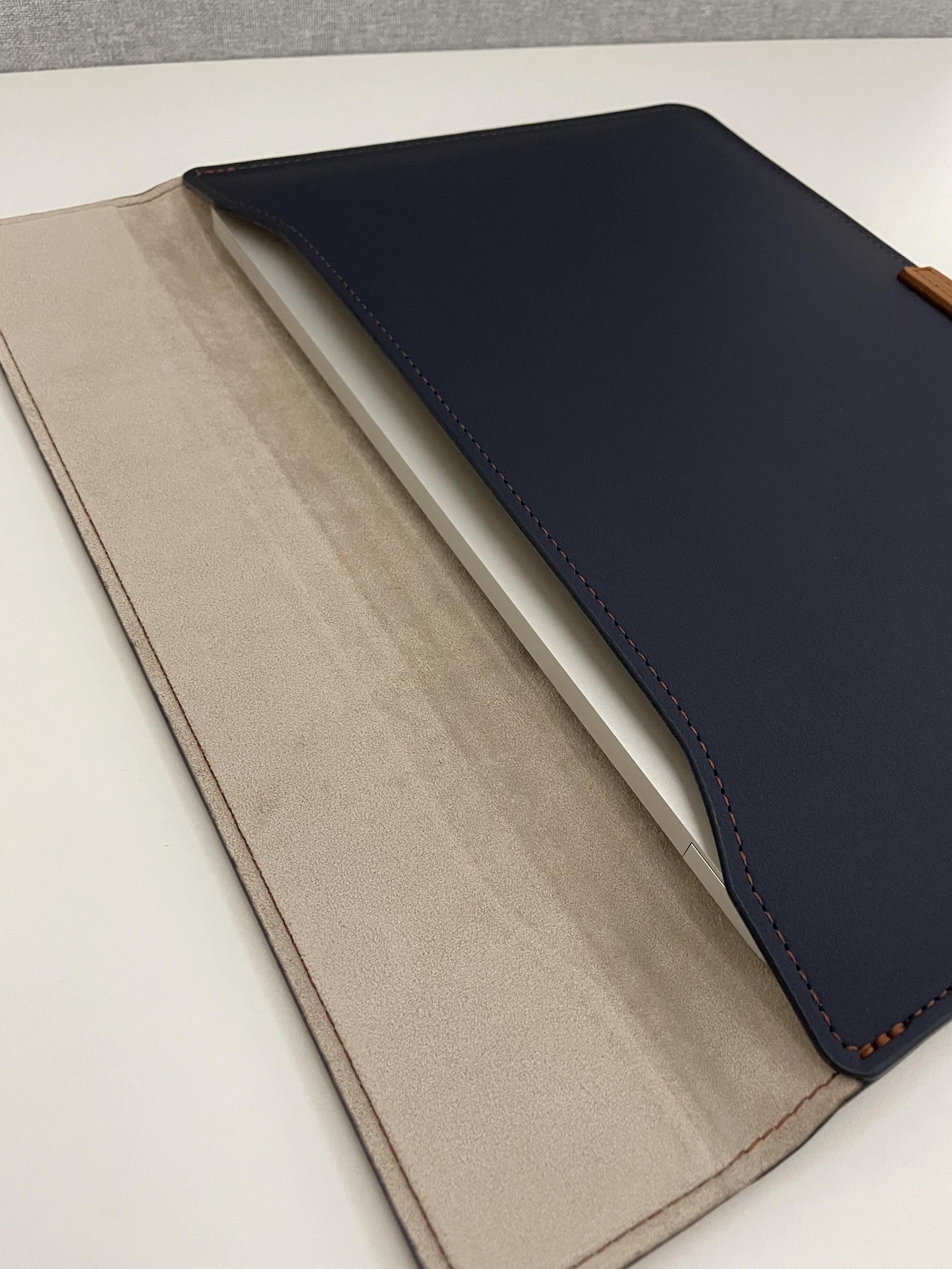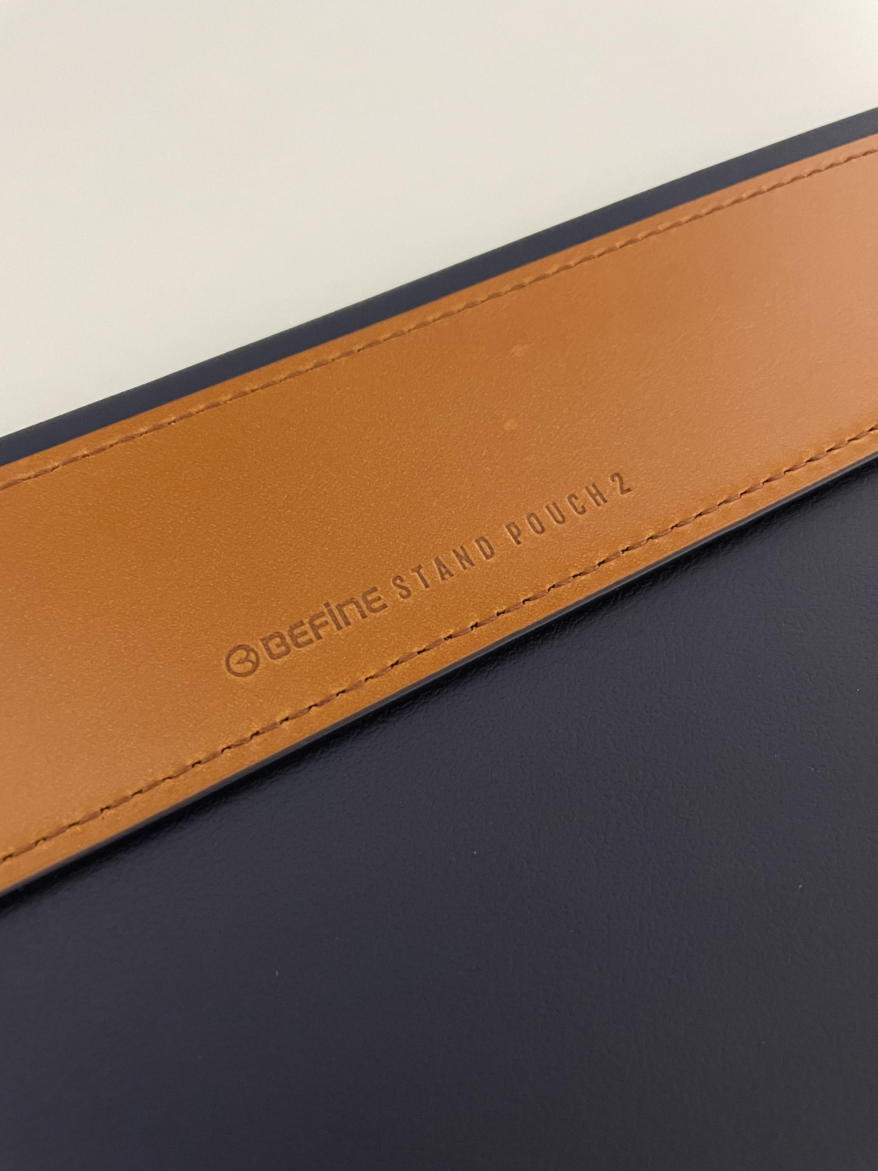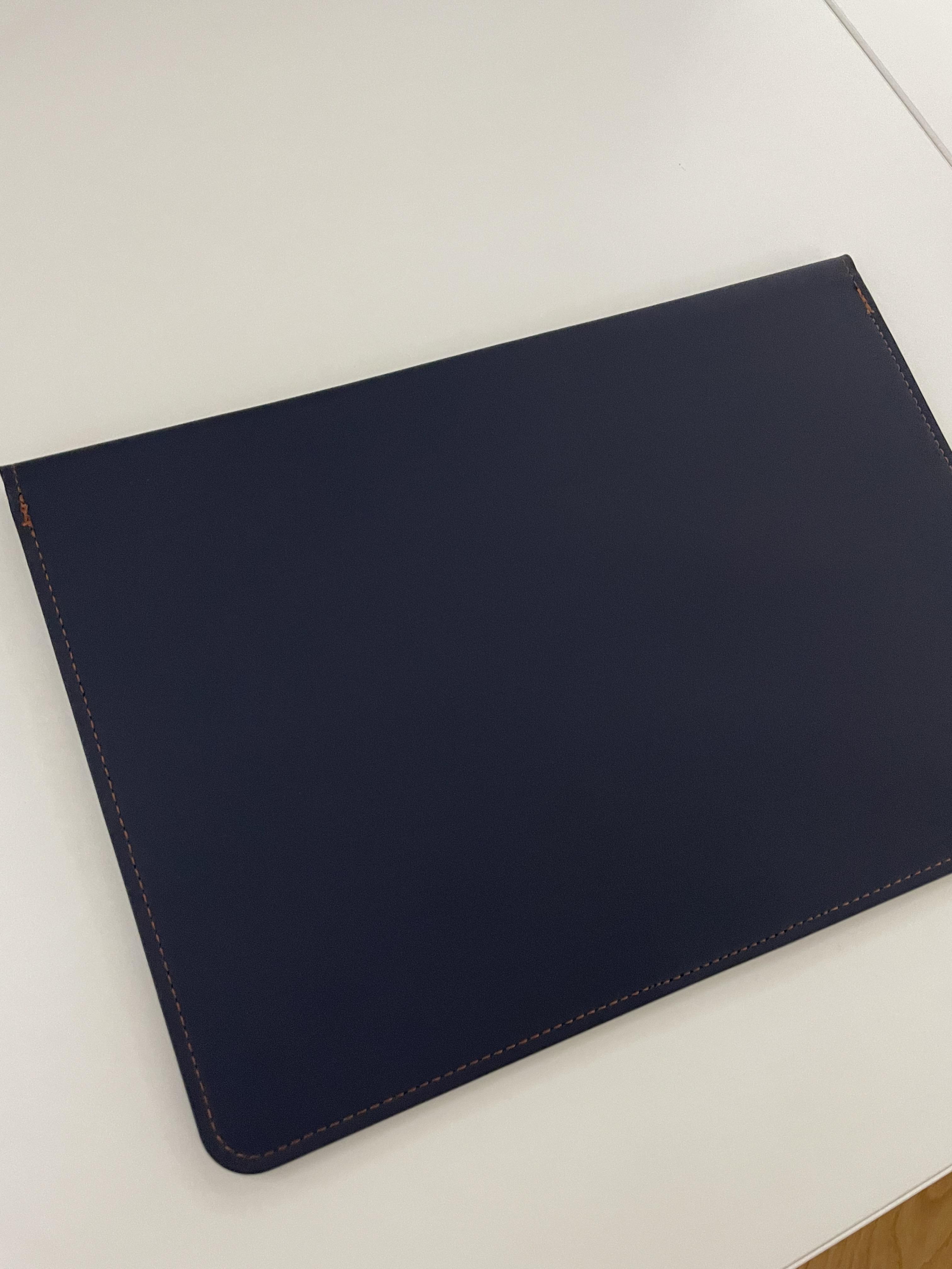 제가 구매한 비파인 맥북 파우치는 네이비 색상입니다. 진한 네이비와 브라운 가죽의 조화가 매우 마음에 드네요.