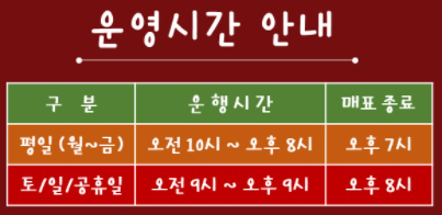 마지막 티켓팅이 가능한 매표 종료 시간은 평일은 오후 7시, 주말과 휴일 빨간날은 오후 8시입니다. 운행종료 1시간 전이 티케팅 가능한 마지막 시간입니다.