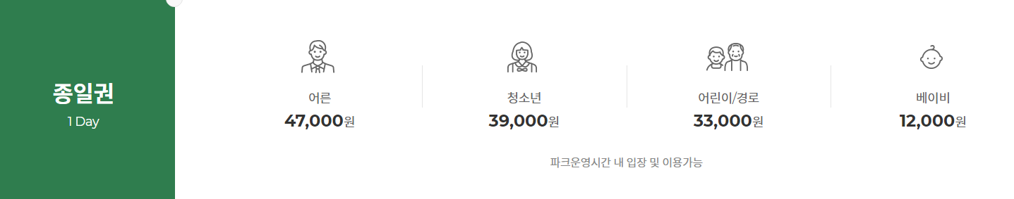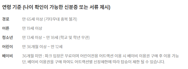 베이비는 36개월 미만인데 12,000원의 입장료가 부과되네요. 단 파크 입장 자체는 무료이고 어린이 전용 놀이기구를 탑승 시에는 12,000원의 종일권이 필요로 한다고 합니다.