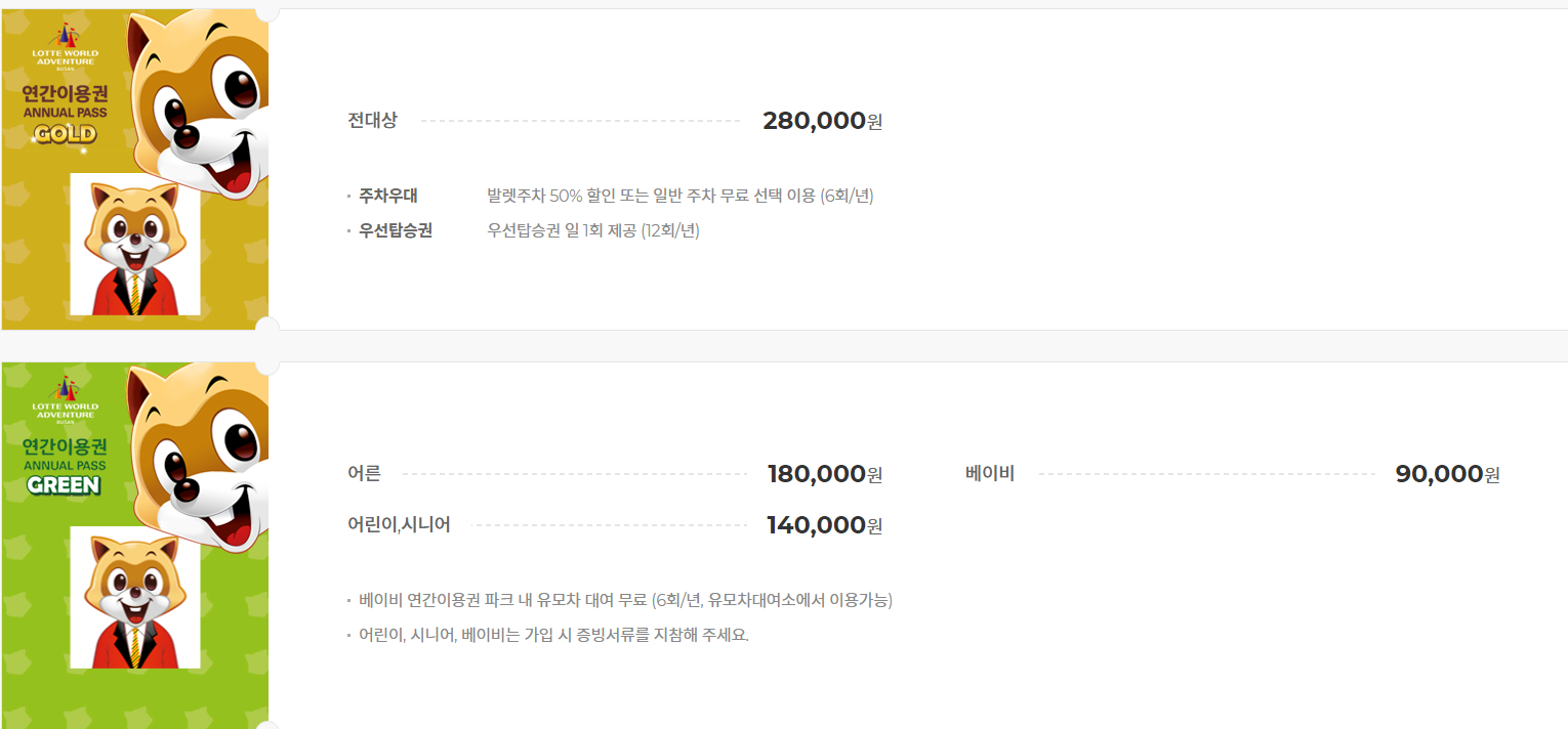 부산 롯데월드 연간이용권은 골드와 그린 등급으로 나뉘는데, 골드의 경우 연령에 상관없이 280,000원입니다.
