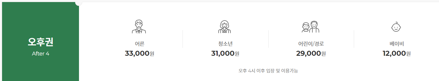 어른은 33,000원, 청소년은 31,000원, 어린이와 경로는 29,000원, 아기는 12,000원입니다. 사실상 종일권과 큰 차이는 없어 보입니다.