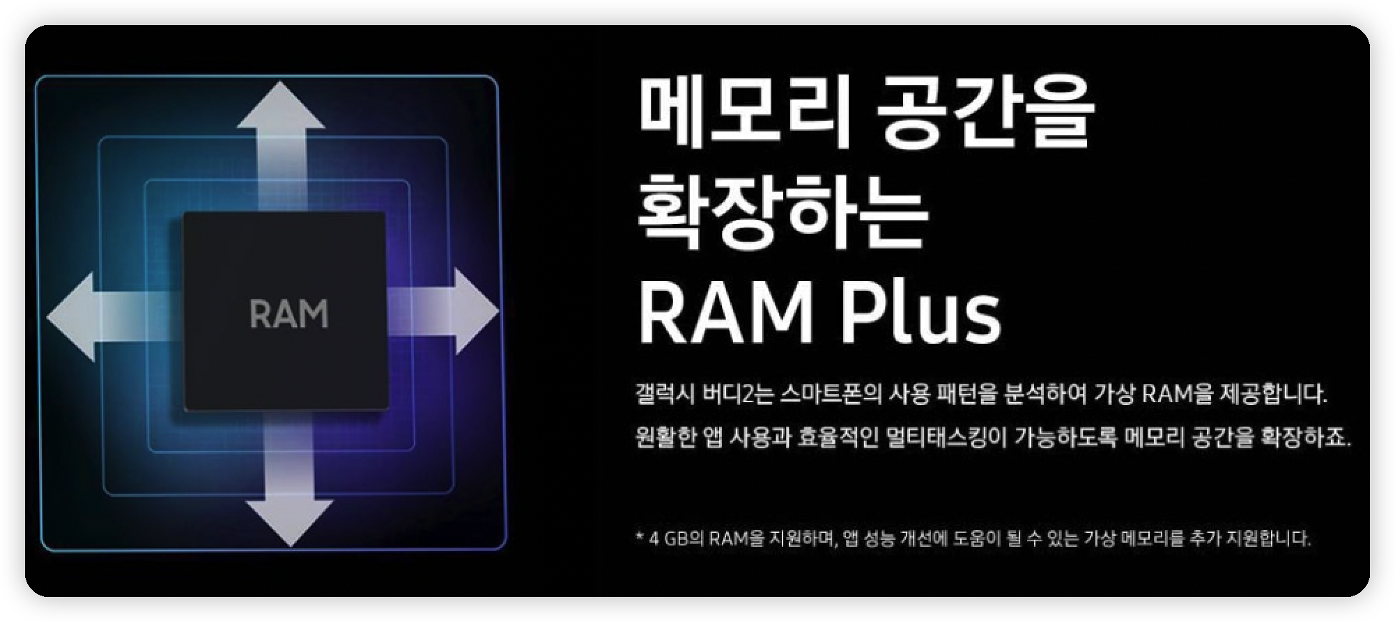 스마트폰의 성능을 좌우하는 AP는 퀄컴 스냅드래곤 750G가 들어갔습니다. 출시한 지 조금 지난 중저가형 AP이지만, 준수한 성능을 보여주기 때문에 게임을 제외하고 일상생활에선 큰 부족함 없는 칩셋입니다. 다만 문제는 램인데, 램 기본 용량이 4GB인 점은 아쉽습니다. 삼성이 이를 보완하기 위해 램 플러스(관련 영상 보기)라는 기능을 넣어주었습니다.