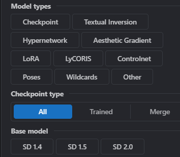 사이트에 들어가셔서 우측 상단에 있는 필터 모양을 눌러보시면, 원하는 종류와 나에게 맞는 스테이블 디퓨전에 해당하는 것들만 보여주기 때문에 훨씬 더 빠르게 원하는 유형의 파일들을 샘플사진과 함께 둘러보실 수 있습니다.