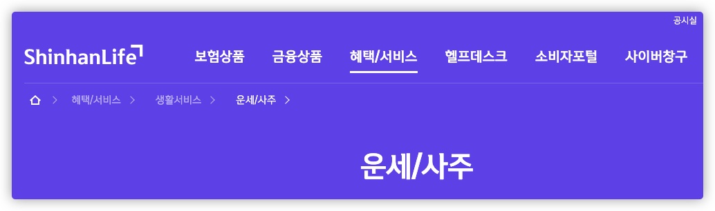 신한라이프 공식 홈페이지이기 때문에, 운세 및 사주 뿐만 아니라 혜택,서비스 탭에서 여러 가지 생활서비스도 조회가 가능하니 참고하시면 되겠습니다.