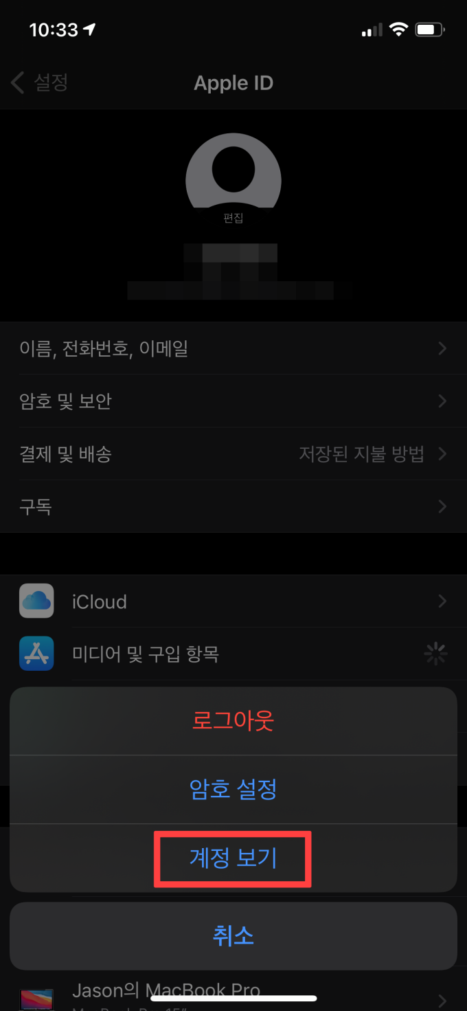 그러면 이렇게 계정 정보가 뜨는데, 여기서 구독과 앱 구입내역을 다 확인하실 수 있습니다.