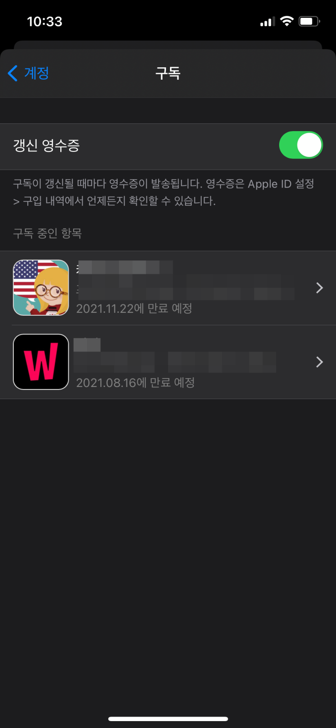 * 이미 구독 취소를 했다 하더라도, 잔여 구독 기간이 남아있다면 구독 중인 항목에 그대로 남아 있습니다.