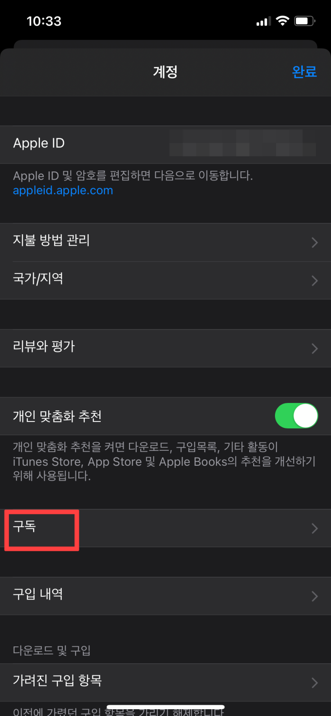 - 4번째 "구독" 터치 (혹은, 미디어 및 구입항목 - 계정보기 - 구독)