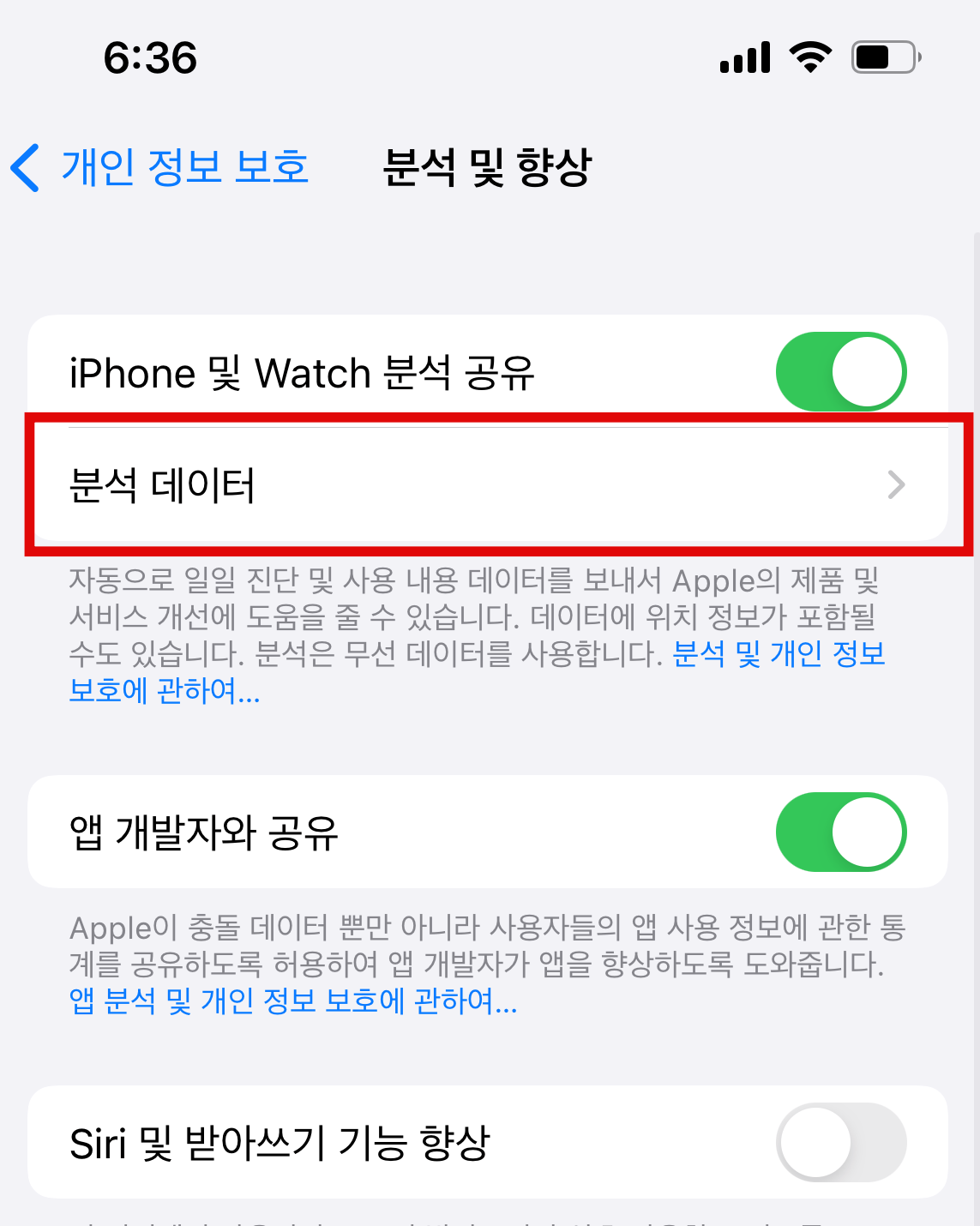 2. 개인정보보호 탭에서 맨 아래쪽 분석 및 향상을 눌러줍니다.