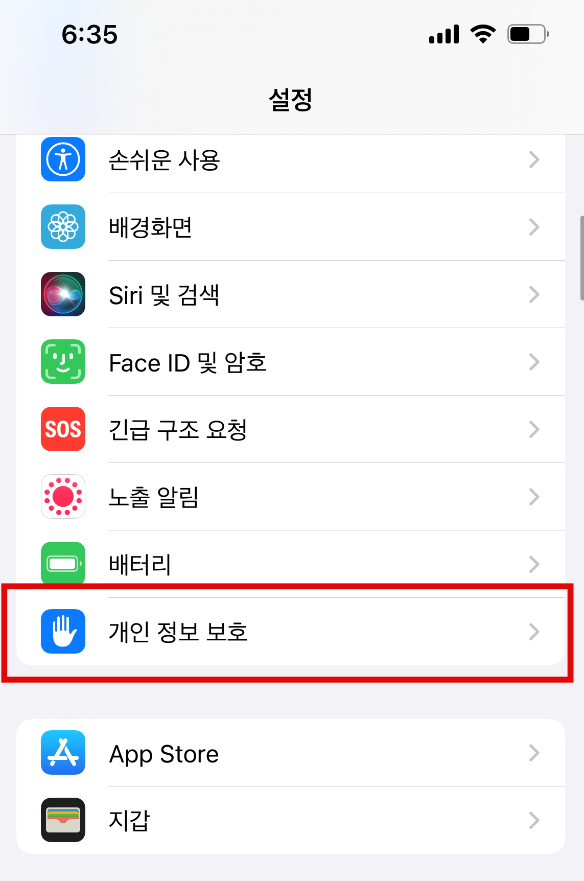 1. 먼저 설정에 들어가신 뒤, 개인정보보호 탭에 들어갑니다.