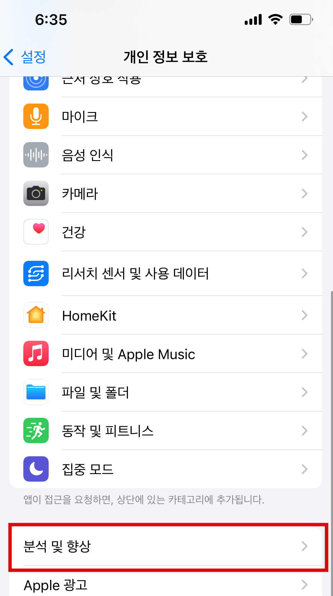 2. 개인정보보호 탭에서 맨 아래쪽 분석 및 향상을 눌러줍니다.