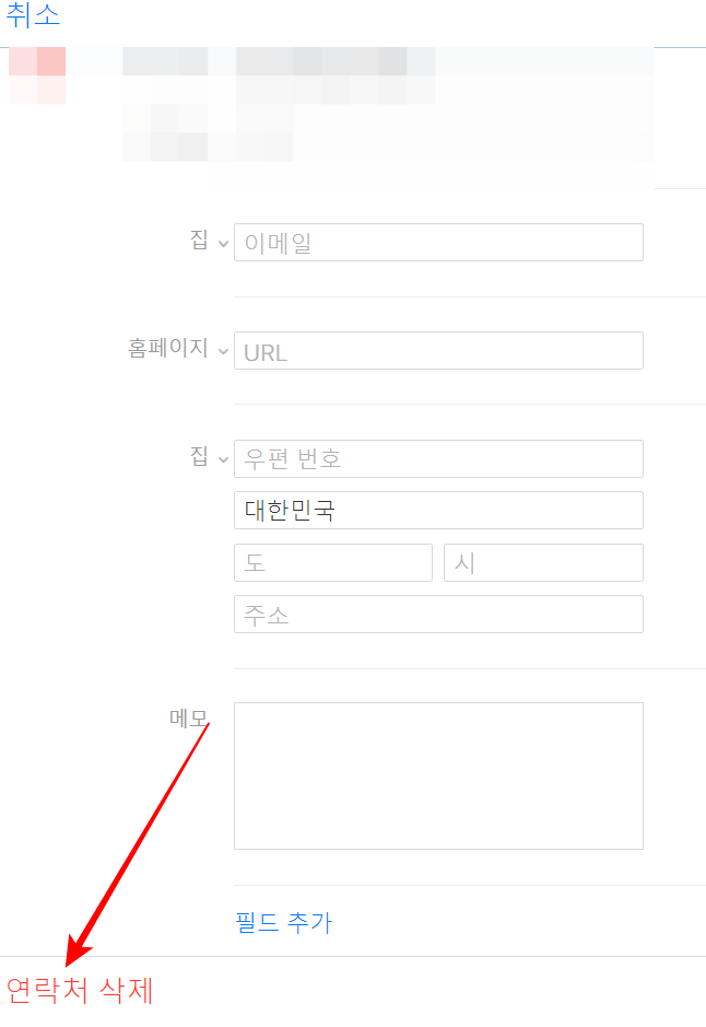그리고 맨 아래로 스크롤을 해서 내려주시면, 이렇게 연락처 삭제라는 붉은색 글씨의 메뉴가 나옵니다.