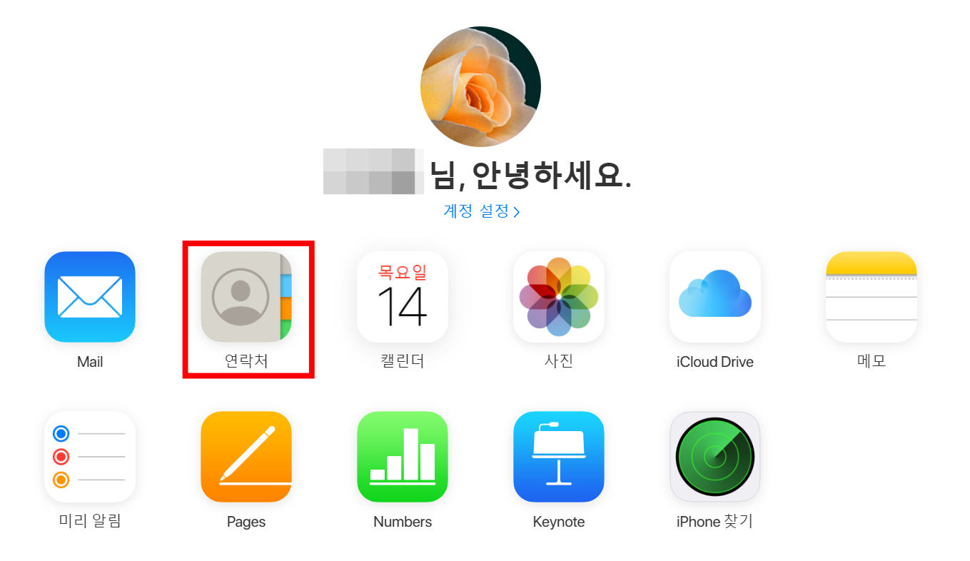 로그인이 완료되면, 아이클라우드에서 관리되고 있는 메뉴 아이콘들이 크게 보입니다.