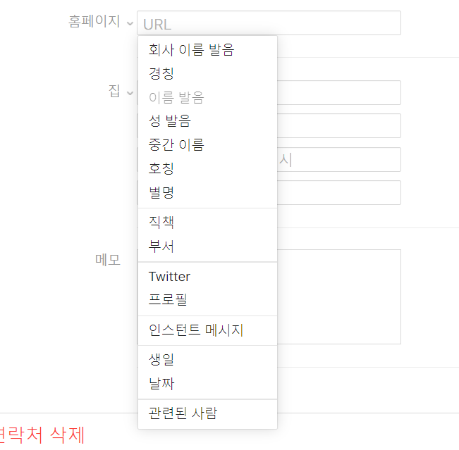 연락처 편집 화면에서 "필드 추가"를 눌러보시면, 위와 같은 메뉴들이 뜹니다.