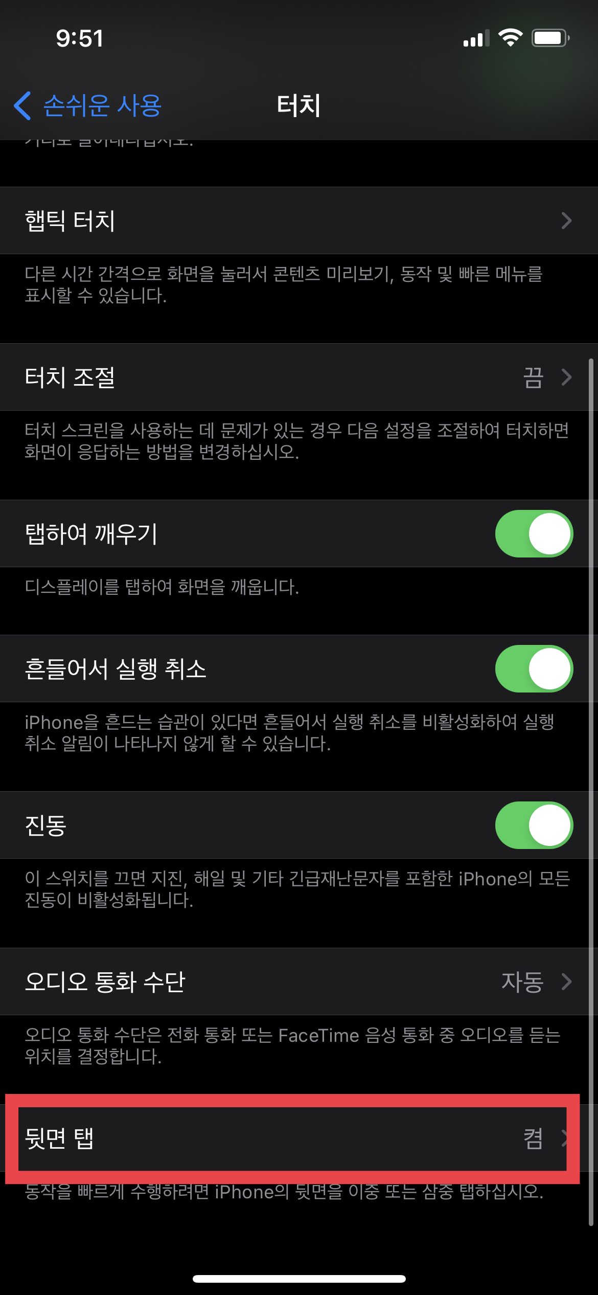 이 뒷면 탭에서 "스크린샷"으로 설정해 두시면, 아이폰 스크린샷을 핸드폰 뒷면을 톡톡 두 번 두드리면 스크린샷이 되도록 설정이 가능합니다.