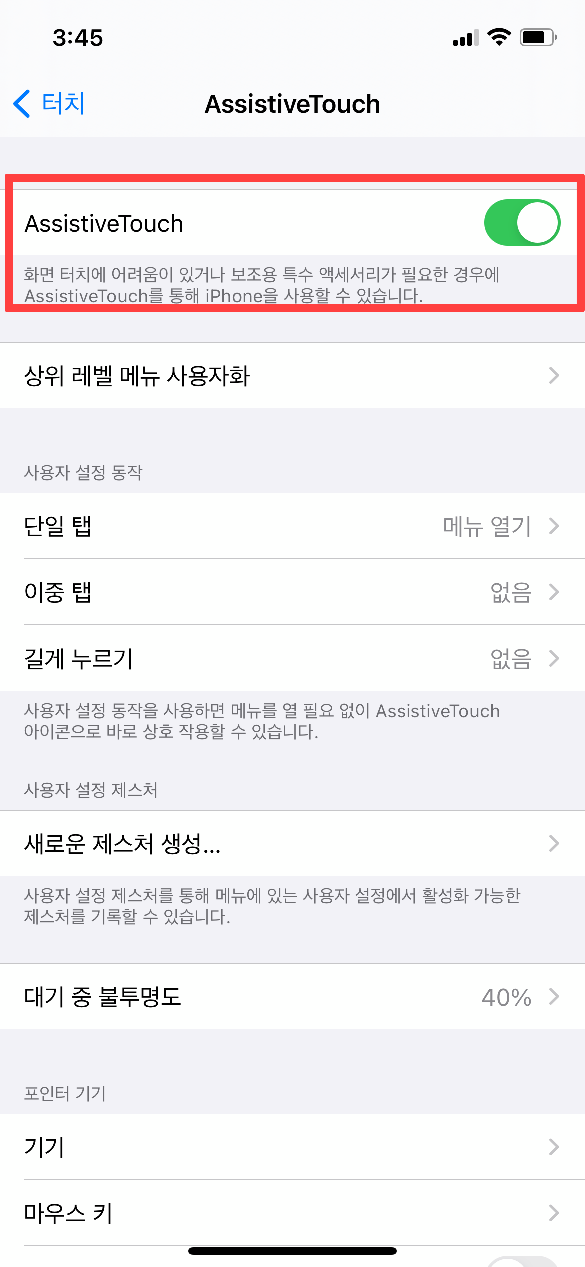 아이폰 설정 - 손쉬운 사용 - 터치에 들어가시면 (혹은 설정 진입 후 맨 위에 검색에서 "assistive" 검색) Assistive touch라는 메뉴가 나오는데요.