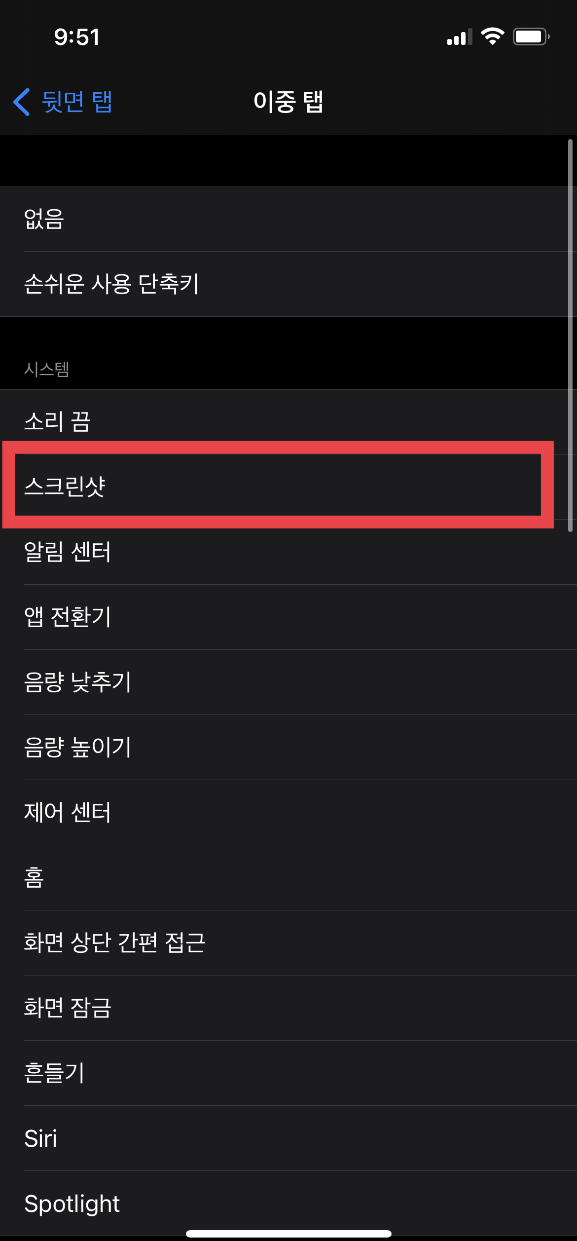 이 뒷면 탭에서 "스크린샷"으로 설정해 두시면, 아이폰 스크린샷을 핸드폰 뒷면을 톡톡 두 번 두드리면 스크린샷이 되도록 설정이 가능합니다.