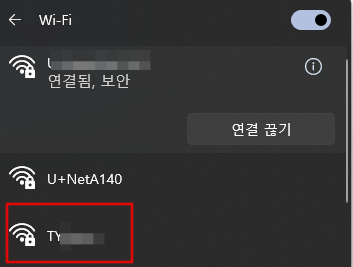 이제 노트북 바탕화면 기준 우측 하단의 와이파이 아이콘을 클릭해서 켜보시면, 이렇게 나의 아이폰 이름으로 와이파이 이름이 뜹니다. 비밀번호 입력 후 연결하면 쾌적하게 아이폰 핫스폿 연결을 통한 컴퓨터 사용이 가능합니다.