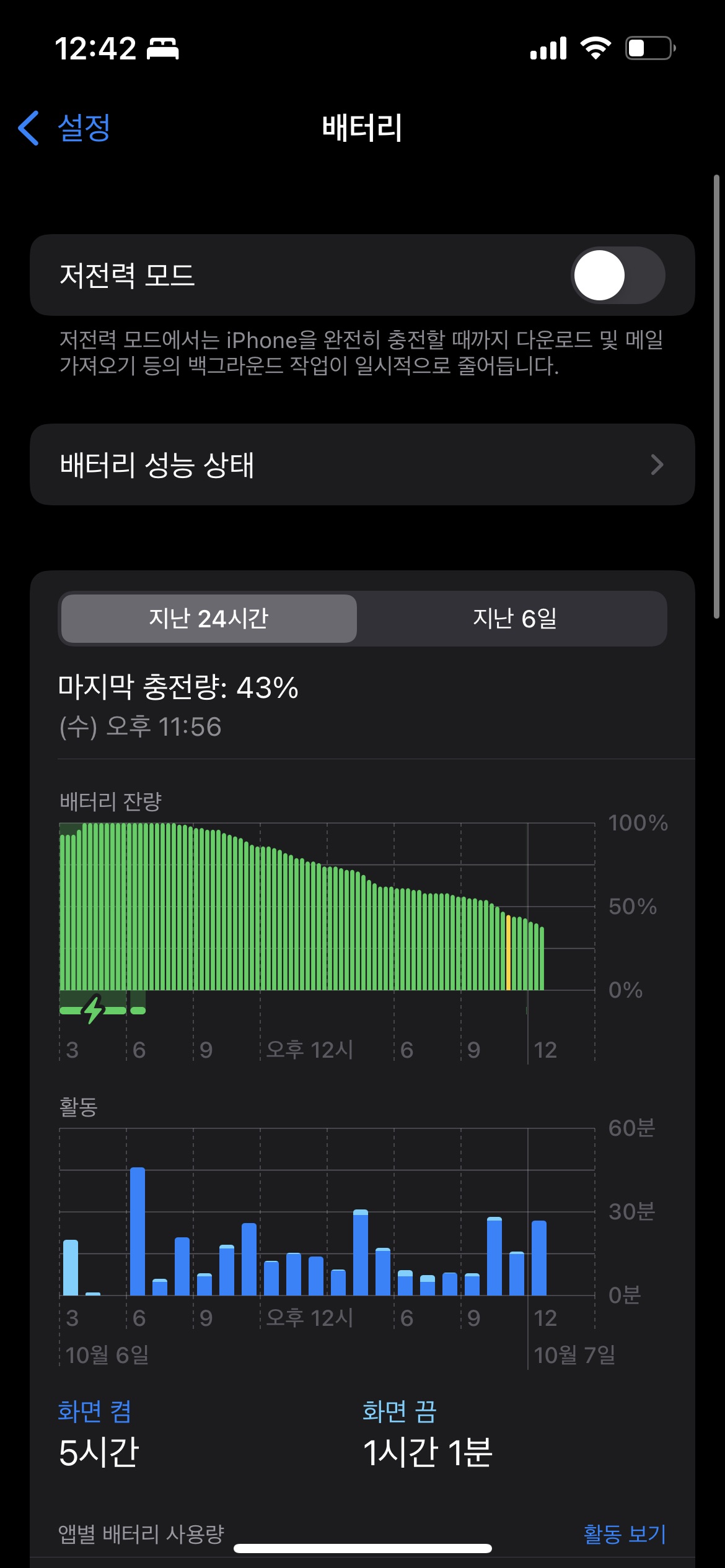 예전에 갤럭시 S20을 사용할 때는, 120hz를 키면 배터리 타임이 20% 정도 줄어드는 게 몸으로 느껴졌는데, 아이폰 12 프로에서 13 프로로 올라오면서는 120hz를 사용함에도 배터리 타임이 늘어나다니 새삼 대단하다고 느껴집니다.