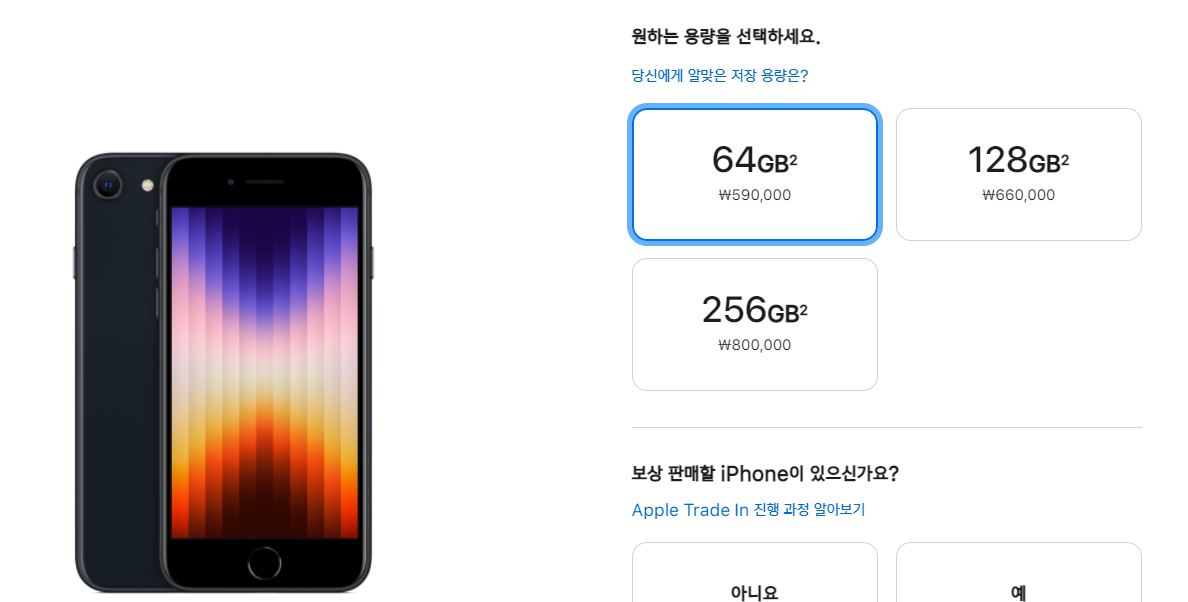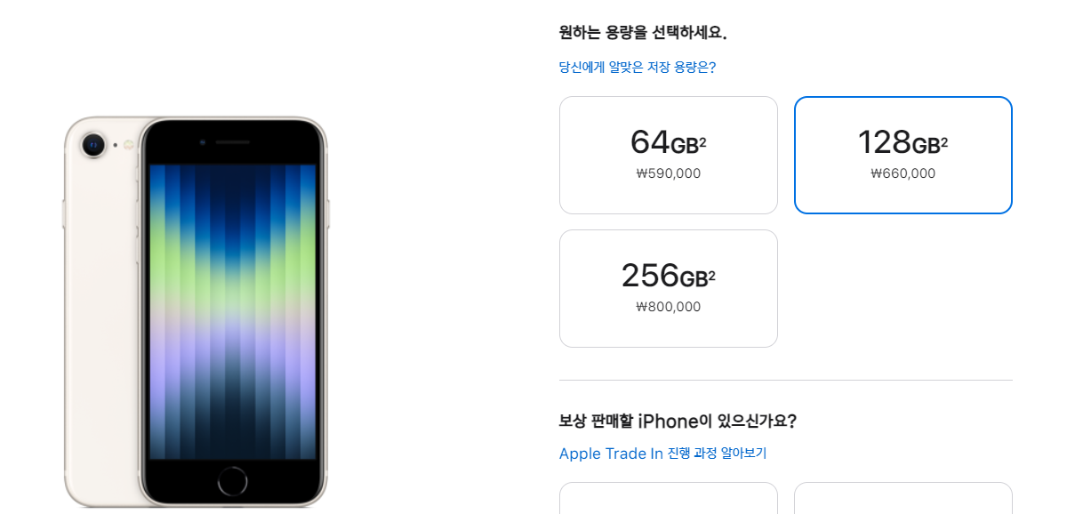 아이폰 SE 3 가격은, 공식 홈페이지 기준으로 64GB 용량이 590,000원, 128GB 용량 모델이 660,000원, 그리고 최고 용량인 256GB 모델은 800,000원 입니다.