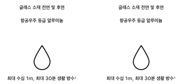 또한 IP67 방수방진 역시 동일하게 지원합니다. 전면 글래스의 경우 강도가 더 강화되었다고 하나, 아이폰 13 시리즈에 탑재되었다고 하는 세라믹 쉴드 얘기는 공식 홈페이지에 없네요.