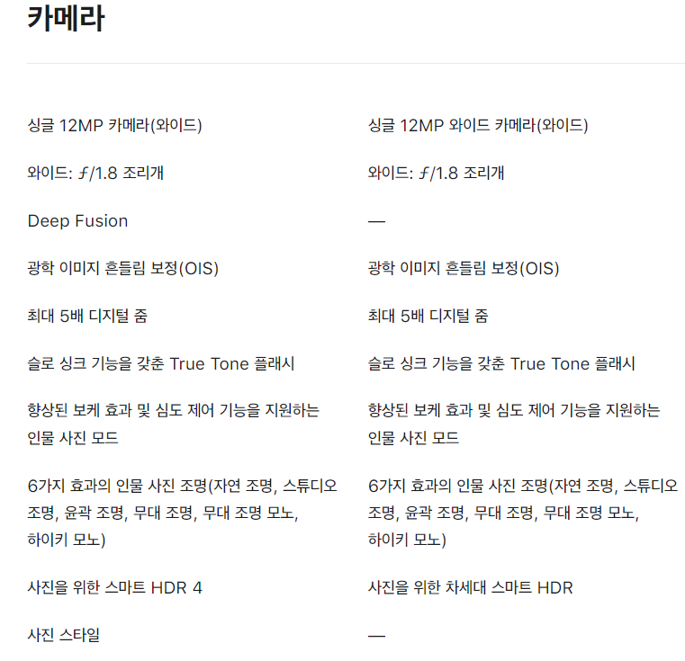 칩셋의 성능 향상으로 야간 모드를 제외한 딥퓨전, HDR 4 등을 지원하지만 기본적으로 카메라 렌즈가 광각렌즈 1개 뿐이며, 이마저도 아이폰 SE 2와 똑같은 스펙의 렌즈입니다. 아이폰 SE 3 구매하셔서 오래 쓰실 분들은 디자인보다도 이 카메라 렌즈 스펙이 두고두고 아쉽지 않을까 싶습니다.