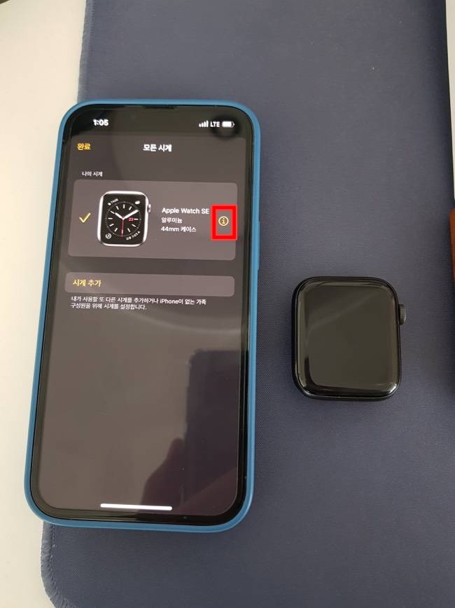 여기서 연결 해제하고자 하는 애플 워치 오른쪽에 i 버튼을 터치해 줍니다.
