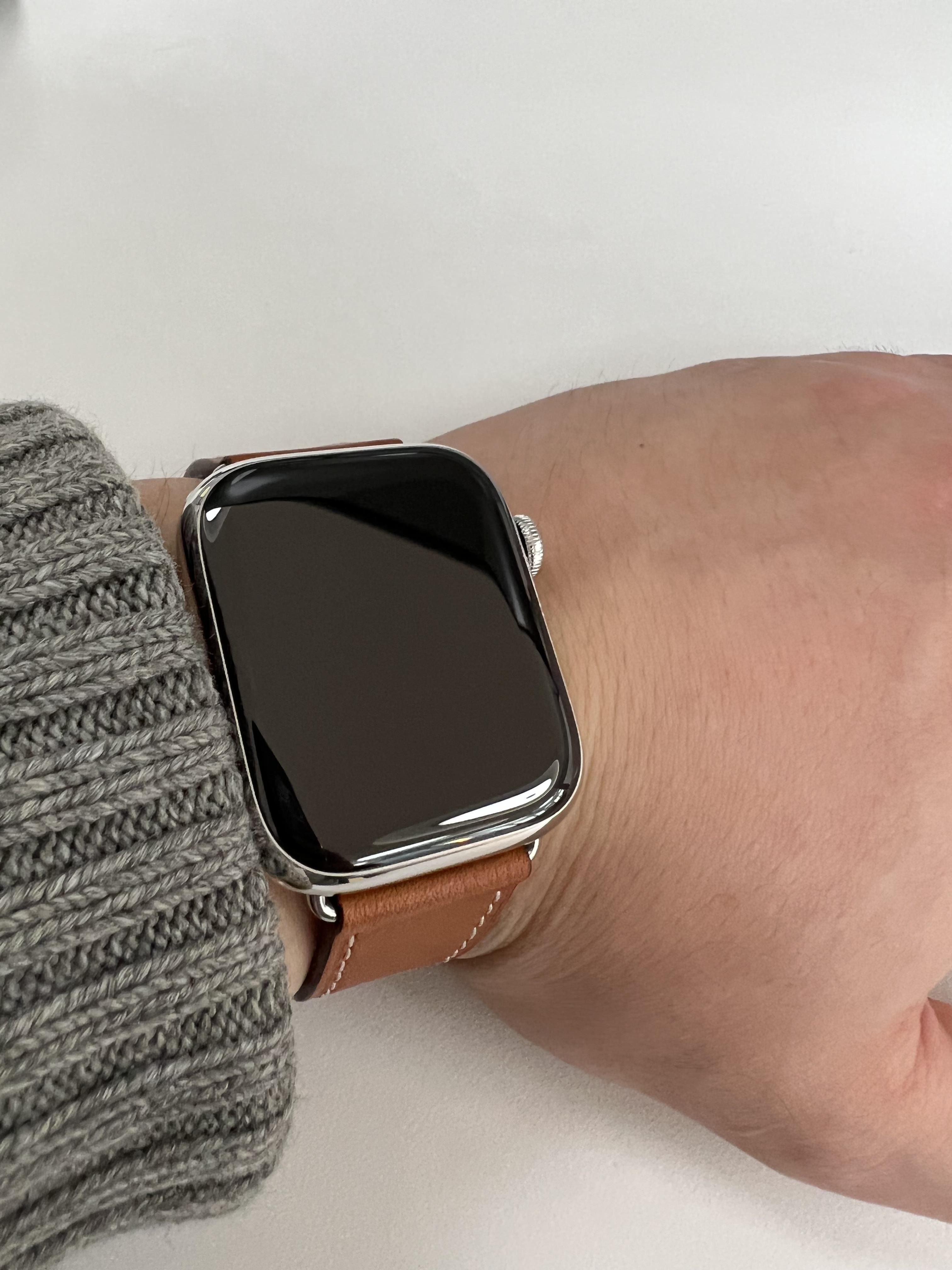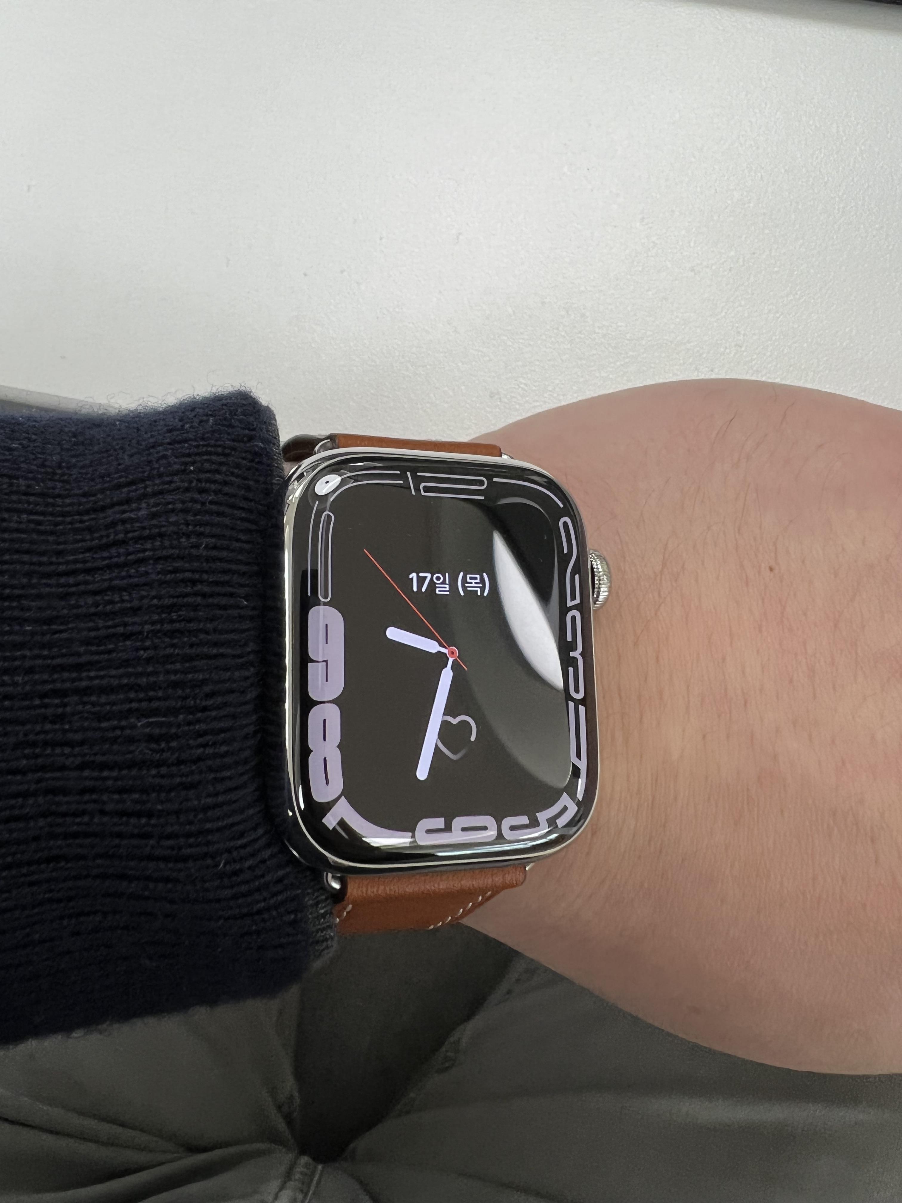 비즈니스 캐주얼에는 애플 워치 7 스테인리스 실버와 가죽 스트랩 조합이 압도적으로 예쁘네요.