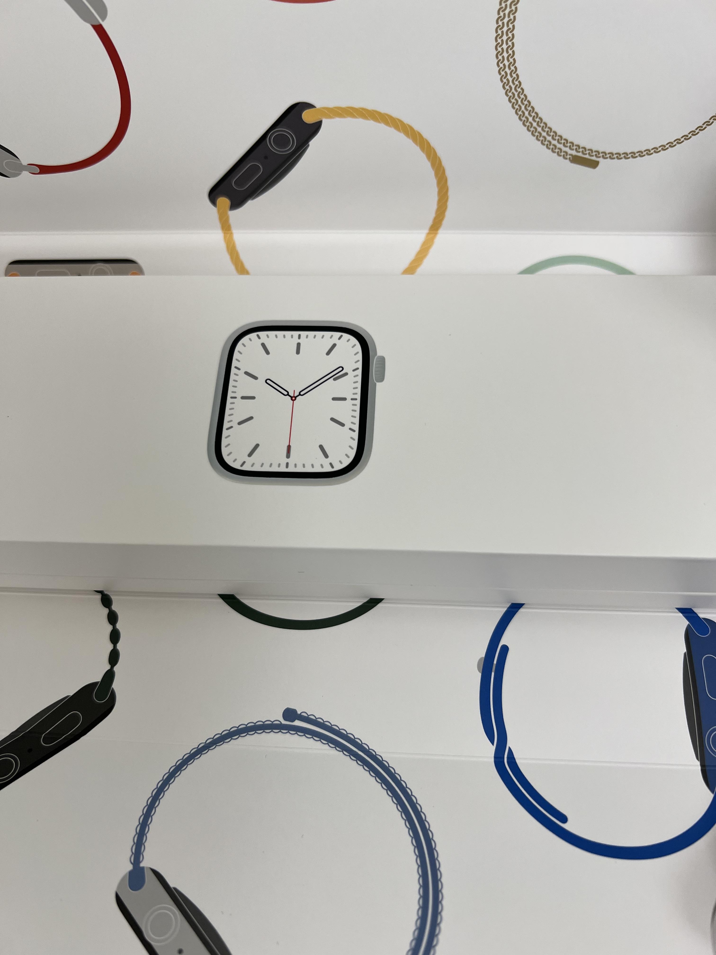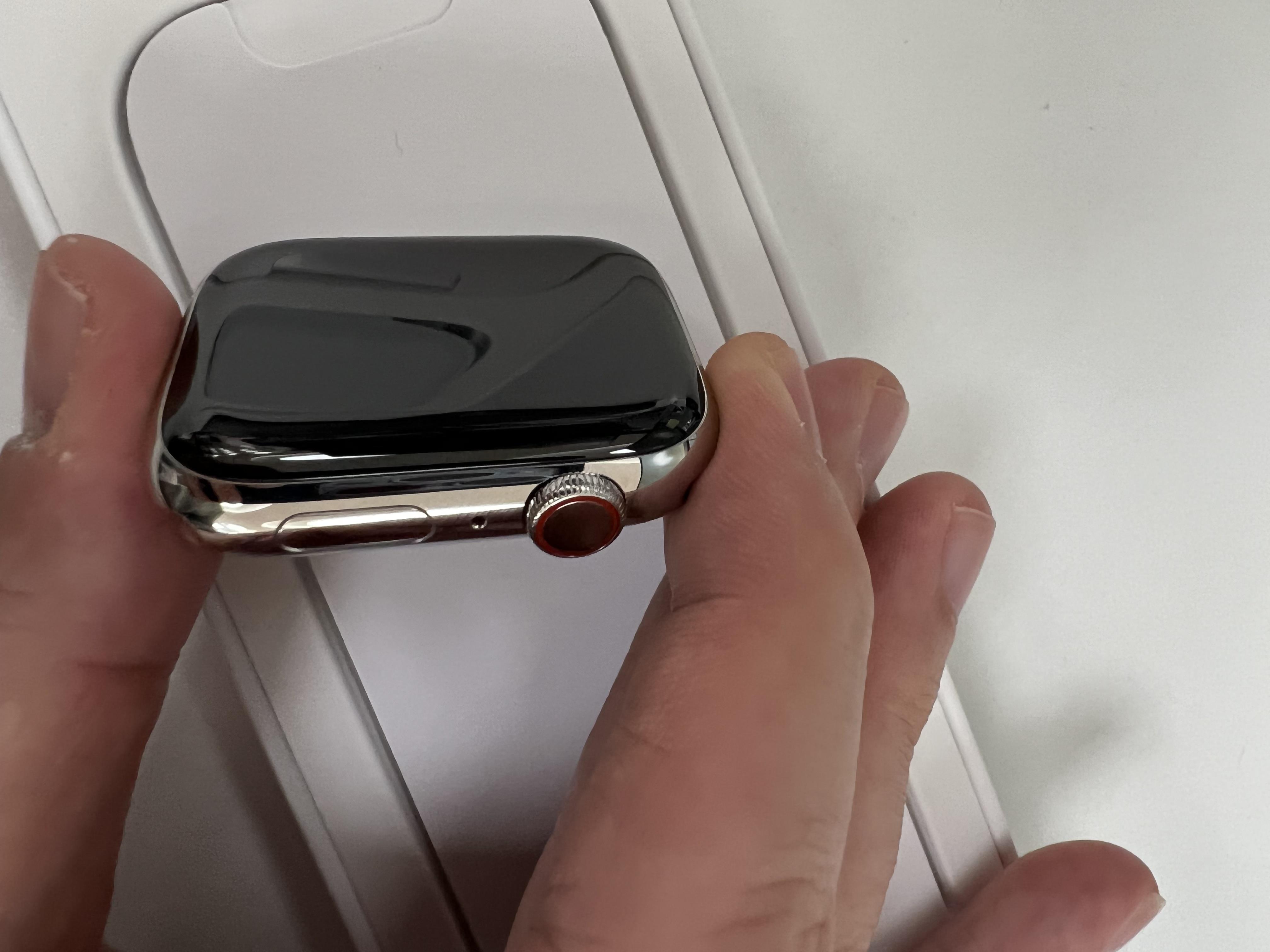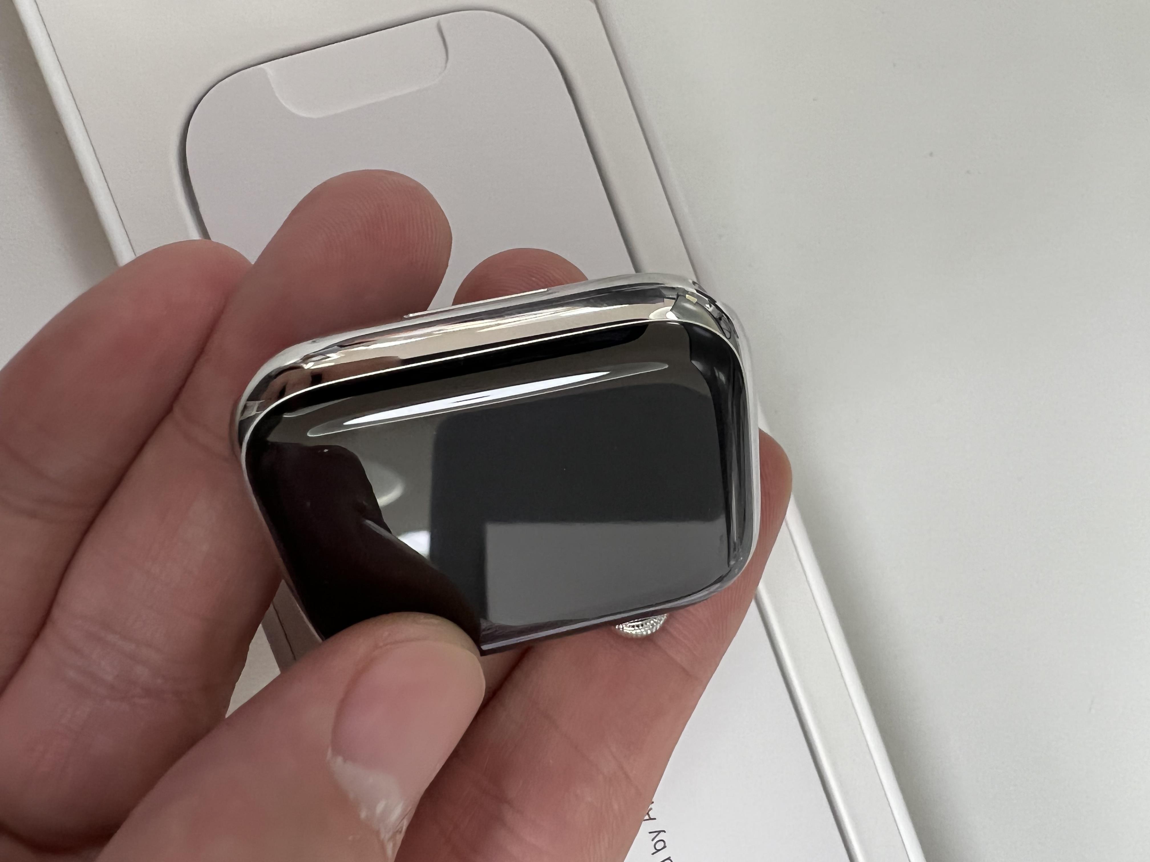 애플 워치 7 45mm 스테인리스 실버 모델입니다. 스테인리스 스틸 케이스라는 말이 설레게 합니다.