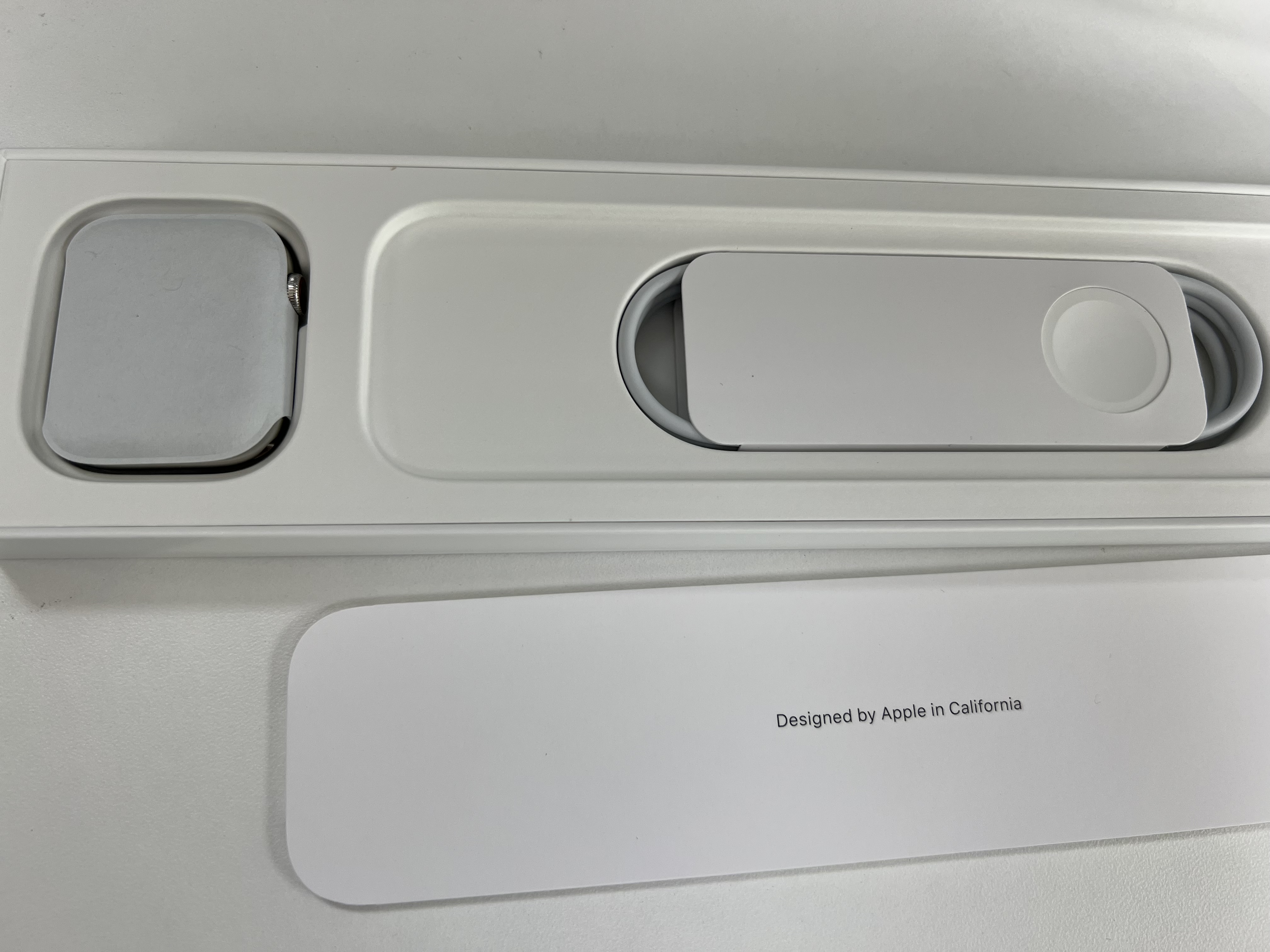 본체가 들어있는 상자를 열면, designed by Apple in California 문구가 적힌 간단 사용설명서, 그리고 애플 워치 7 45mm 스테인리스 실버 본체와 충전기가 들어있습니다.
